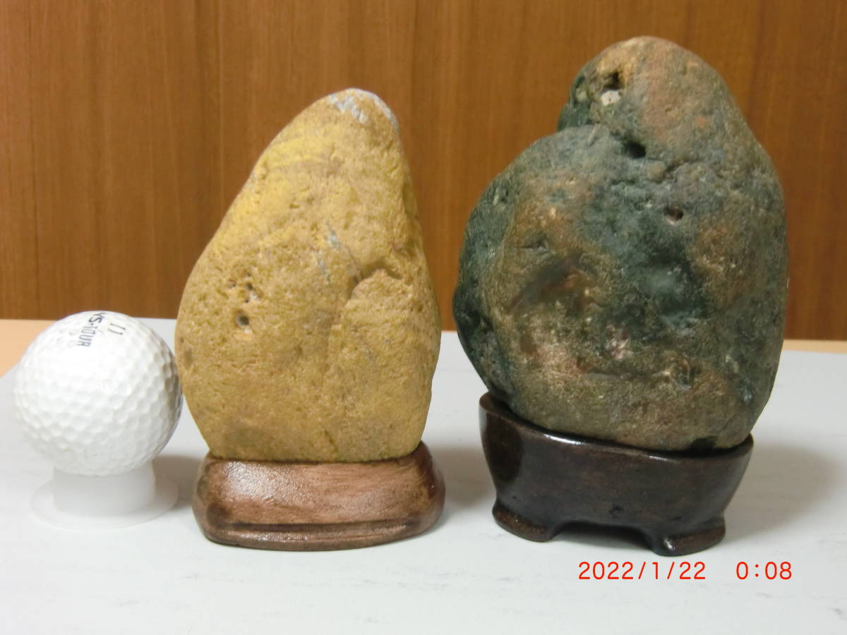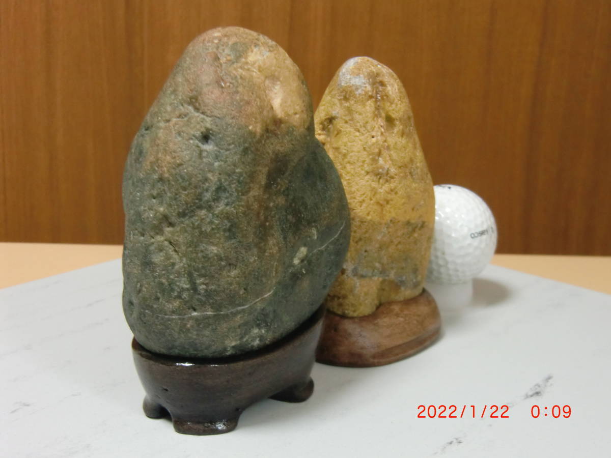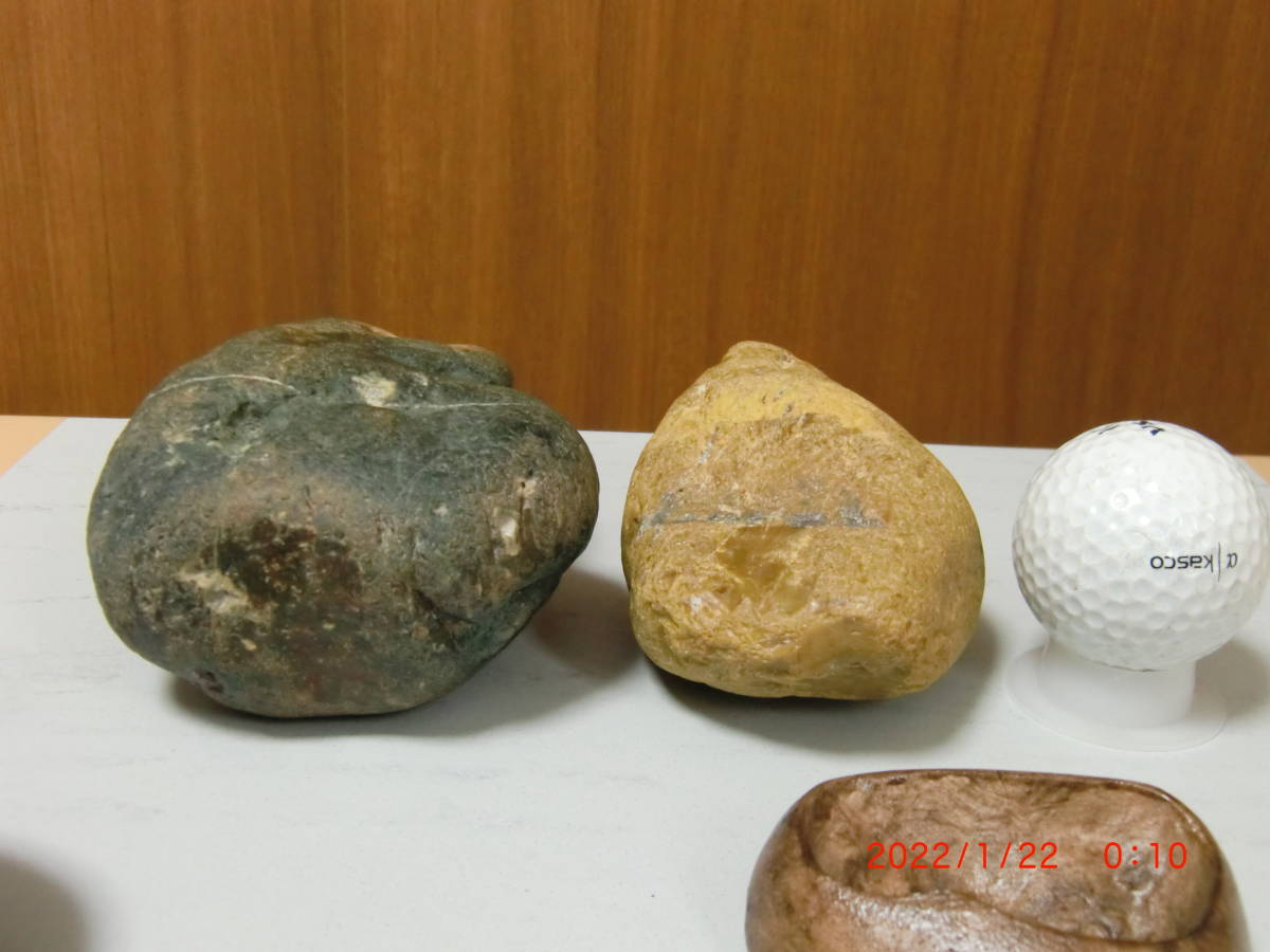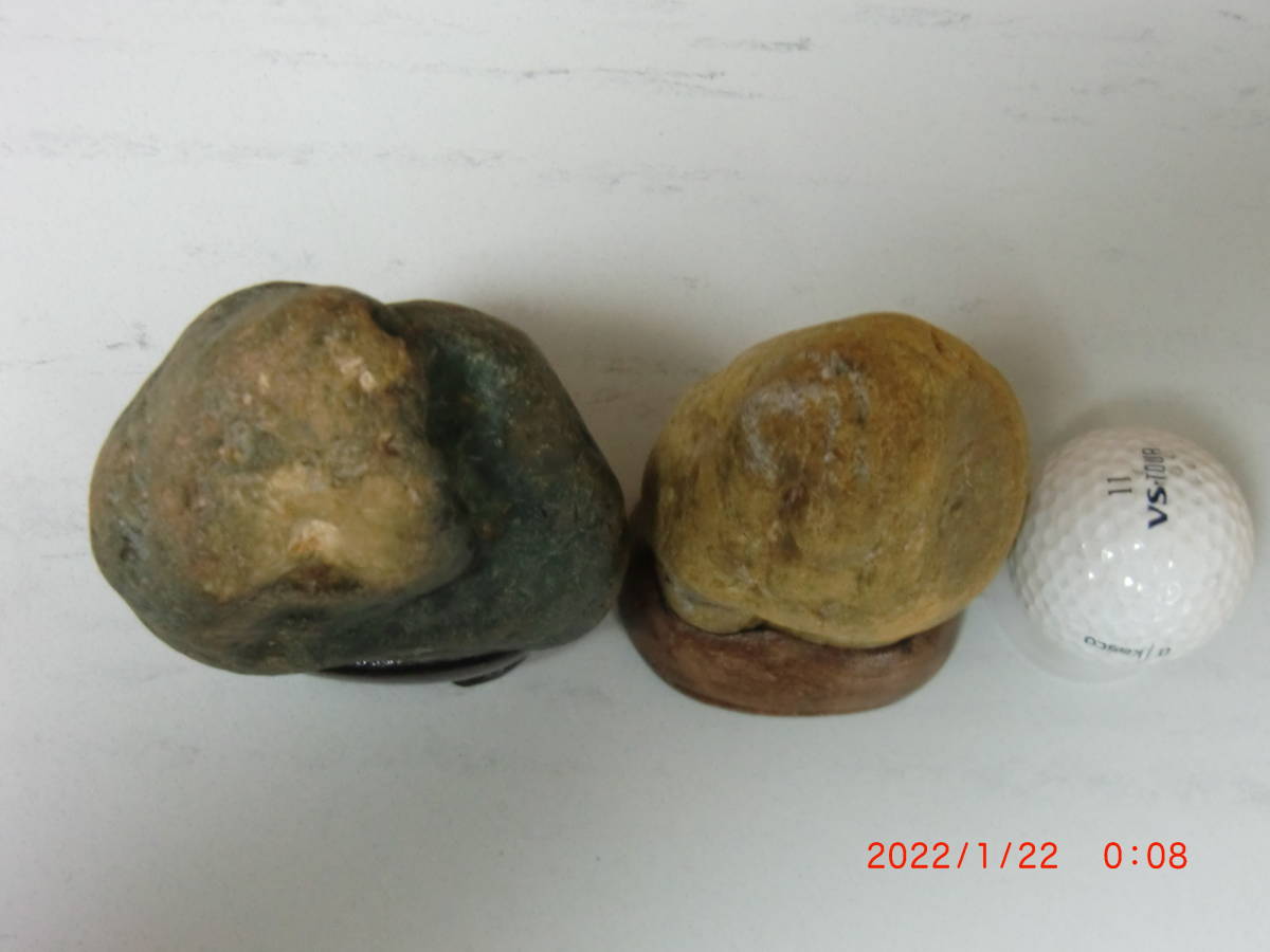 ①大きさは写し込みのゴルフボールを参照してください、重さは2ケで1.05kgです。土岐石展即売コーナーからの購入品。