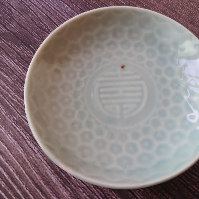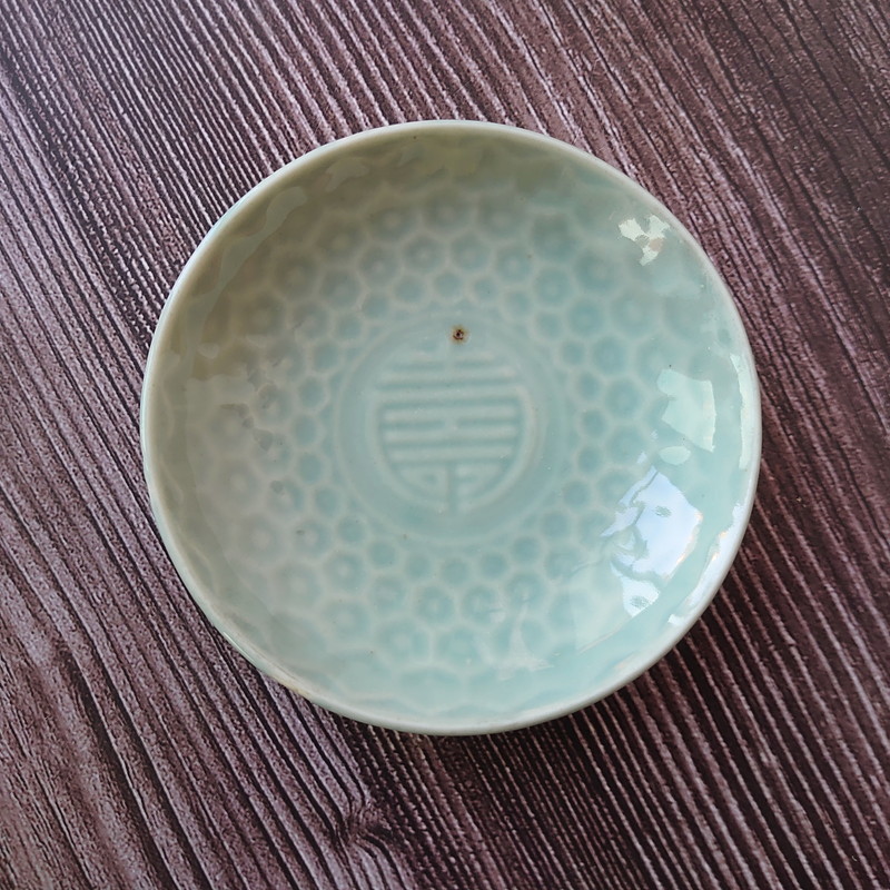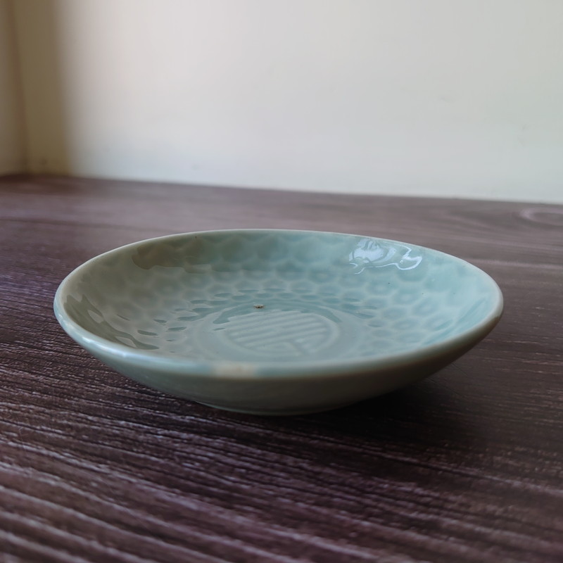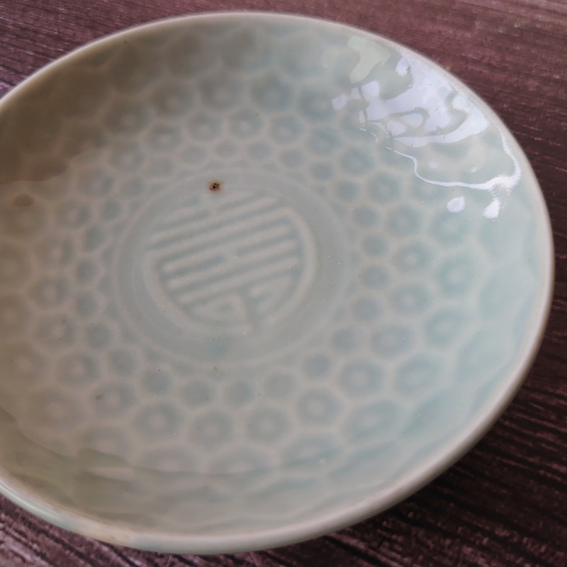 台湾のちょっと古くてちょっとレトロな食器です。 ◆豆皿 小皿 寿 グリーン 中央にある寿の文字と全体のエンボスが印象的な豆皿です。 薄いグリーンの釉薬が可愛らしいです。 古い食器屋さんにデッドストックで残ってた未使用品です。 【状 態】 ●新品未使用のデッドストック品ですが、 昔の製法で生産された物のため、釉薬のムラや黒点、貫入などあります。 【規 格】・直径8.5×2cm 【材 質】・磁器 | |||
