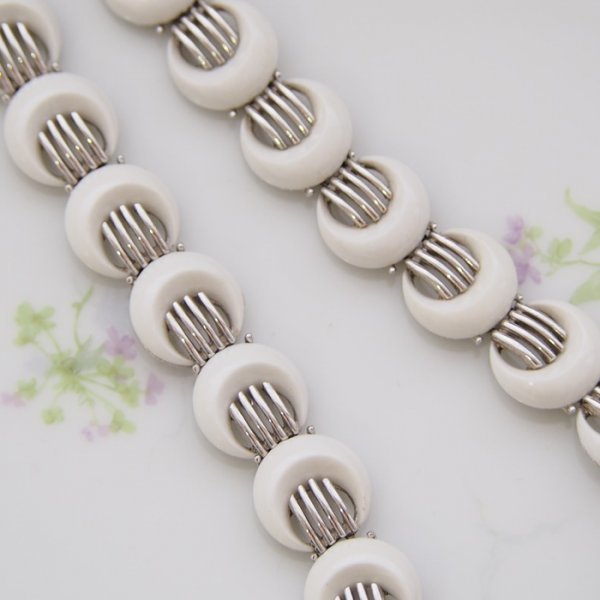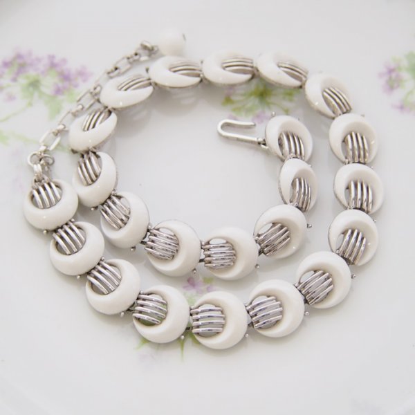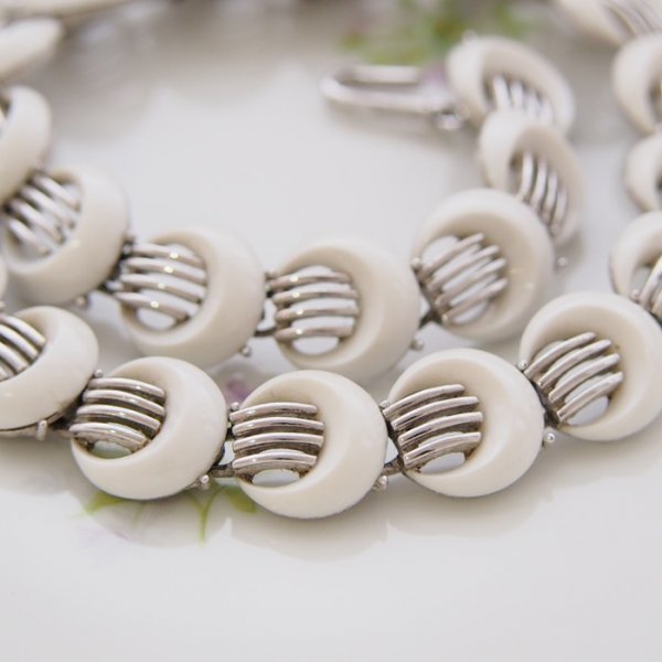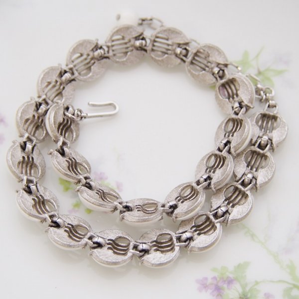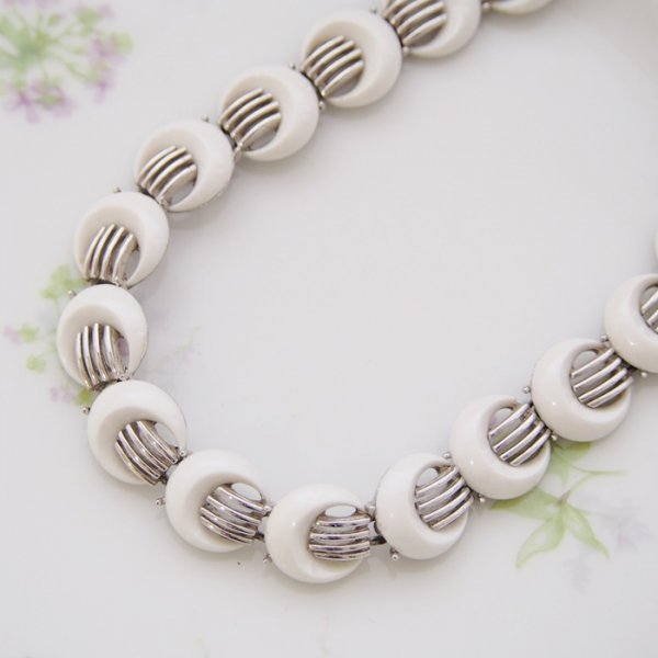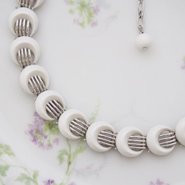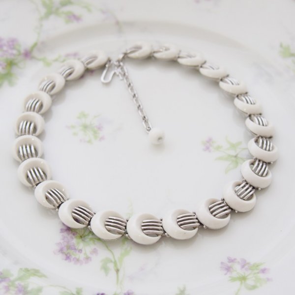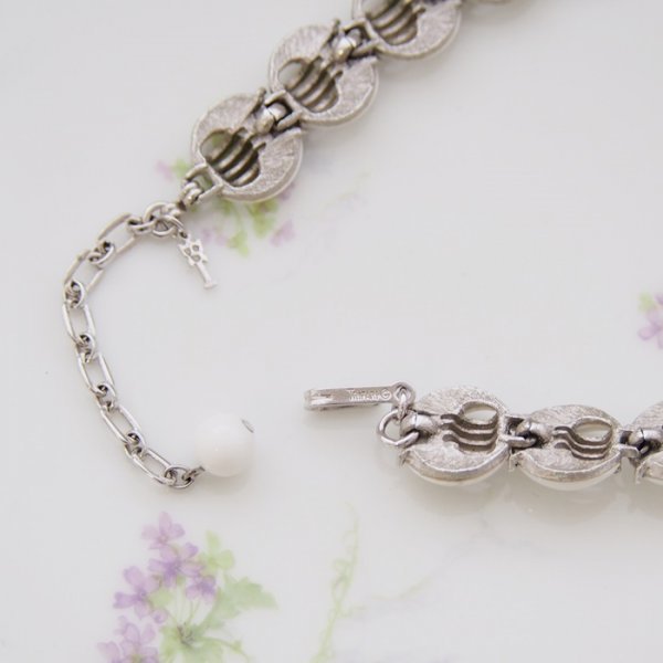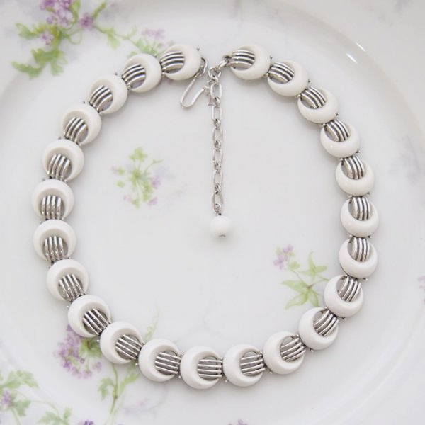 アメリカのコスチュームジュエリーメーカー、Trifariのネックレスのご紹介です。 シルバーメタルとホワイトルーサイトのネックレスです。 ふっくら丸いボタンが並んだようなデザイン。 ホワイトとシルバーの組み合わせが清楚な雰囲気です。 経年の為、多少の小キズや小さな汚れが見れらます。 ■ブランド: TRIFARI ■刻印: TRIFARI© ■サイズ: 約36㎝ (+アジャスター約5㎝) ■重量: 約47g アンティーク・ヴィンテージ商品には、経年による傷や劣化などがあります。 目立つものはアイテムの詳細に記載しておりますが、説明以外にもキズや損傷などがある場合がございます。 古いものですので、ご理解いただける方のみご入札下さいませ。 他サイトでも販売しておりますので、同時にご注文があった場合は、品切れの場合もあります。その場合は、大変申し訳ございませんが、ご注文をキャンセルとさせて頂きます事をご了承くださいます様お願いいたします。 | |||