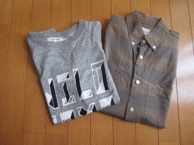 メンズの長袖シャツ2枚セットで・・・。ボタンダウンのシャツはGAP、グレーのトレーナーの形のカットソーはGLOBAL WORK。