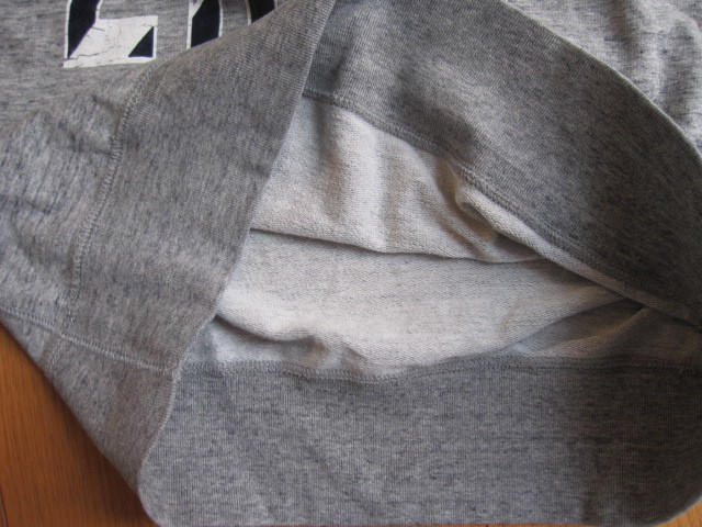 トレーナー形ですが生地はカットソーを若干厚めにした程度の薄手。割れ文字プリントと霜降りグレーがマッチ。