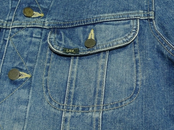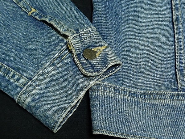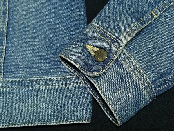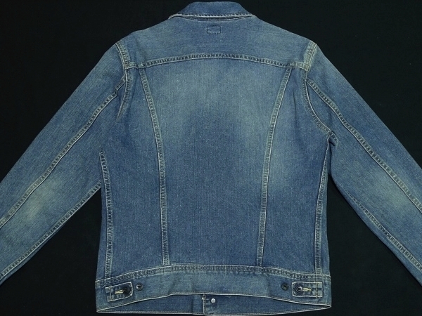 「Lee リー」の「BASIC TOPS」シリーズの米国産オーガニック・コットンをブレンドしたインディゴ・デニムを使用したカウボーイ・ジャケット「101J RIDERS JACKET」(品番10411-646、定価15,000円、税込み16,500円)のサイズLARGE(40相当)になります。カラーはインディゴのライト・ユーズド・ウォッシュで長年着込んだ感じ仕上げたユーズド加工が施されています。オールド・タイプの「101J RIDERS JACKET」を現代的なタイトなフィット感を重視してアレンジしたモダナイズド・モデルになります。米国産オーガニック・コットンを30%ブレンドしたヴィンテージな雰囲気を持たせた13OZ左綾デニムをイエロー・ステッチで縫製したデニム・ライダース・ジャケットで、サイドアジャストは黒のネコメボタン、「Lee RIDERS」表記のみの黒四角タグ、小文字eの「Lee」、R、表記でMR表記無しの胸ネームと101Jの伝統仕様を受け継ぐ、ボディーにフィットする立体裁断のタイト・シルエットのモデルになります。ロング・ウォッシュによる淡く仕上げられた美しいグラデーションの色落ち、シェービングによる細かなアタリづけ、衿やポケットフラップの縁のスリキレ、ネームの色落ちなど丁寧なユーズド加工により着込んだ感じ仕上げられています。状態はライト・カラーに仕上げたユーズド加工が施されたモデルで全体に使用感があります。実際の着用による襟周りの若干のスレなどはありますがダメージなどは無く、汚れやシミなども無く、全体的にキレイな非常に良い状態になると思います。メーカー適合サイズは身長175cm~185cm、胸囲96cm~104cm。実寸は肩幅約46cm、着丈(衿下より)約61cm、身幅(腋下で)約54cm、袖丈約64cmとなります。(素人採寸ですので多少の誤差はお許し下さい。)日本製。素材表示は綿100%(米国産有機栽培綿30%含む)。「Lee・リー」のライダース・ジャケットの新たなベーシックとなるモダン・フィット・の人気モデルになります。 | |||