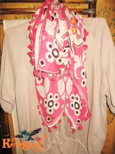 インド製エスニック花柄フリンジ正方形ストール・スカーフPK白×ピンク系 マルチクロス テーブルクロス