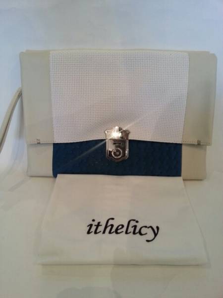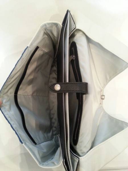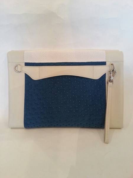 お色はアイボリー×ブルー、素材は本革、サイズは、幅約34㎝、高さ約23㎝、マチ約3.5㎝になります。