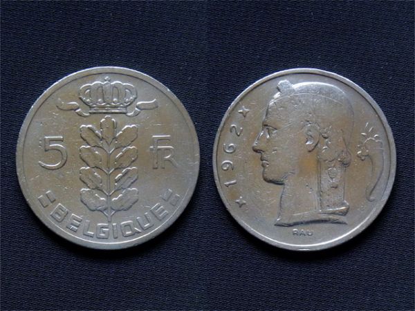 【ベルギー】 5フラン Fr 1962年 白銅貨