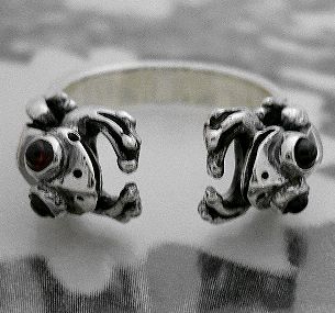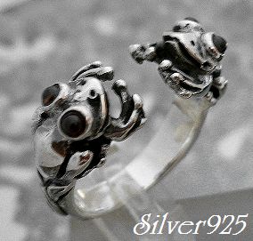 シルバー925銀の天然石ガーネット4個付カエル Wフロッグ リング/フリーサイズ