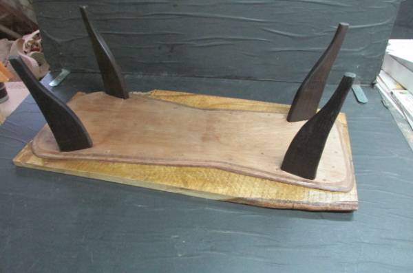 飛騨の山深い所にその白樫の木は生息しておりました。最大直径1m80cm化け物のように見えるたたずまいの生き物でした。その木を製材してびっくりしました。その木にはその木の歴史が余すことなく刻まれていました。類をみないほどのすばらしいスポルテッドでした。木に腐食菌が入り生地の部分に色が付いたり、予想も出来ないような模様が現れるものをスポルテッドと呼びますがその模様や色合いは本当に稀なものでした。その二度と出ない板を使ってそれを飾り台に仕上げました。スポルテッドの現れる木は木にすが入っていたり、弱くなっている部分があったりしますので、黒いウエンジの足を取り付ける時には丁寧に補強をしたうえで行いました。仕上げは木に色の付かない仕上げであるポリウレタンのクリアー仕上げで仕上げました。