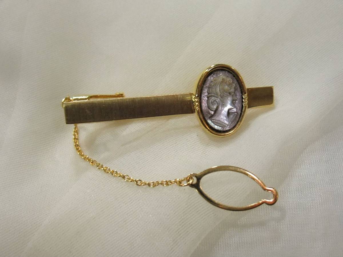 画像の、ゴールドーカラーのスタイリッシュなタイバー、ネクタイピンです♪美品ですが古いので少しの経年感はあります。でもかえって着こなれた感じを演出できます♪昔、日本のデパートやショップで購入したコレクションの中から、出品です♪シンプルですっきりしたデザインで、お色も綺麗なゴールド系で、紺や茶のタイや服に合わせやすいタイプです☆若者の中には、マネークリップ代わりに使用している方もいて、そんな使い方も格好いいと思います♪未使用ですが、古くて、ざっくりまとめて箱に入れて保管していたので、ややスレなどの経年感はあるかもです☆でも古いわりにはなかなか状態の良いお品でお薦めです♪