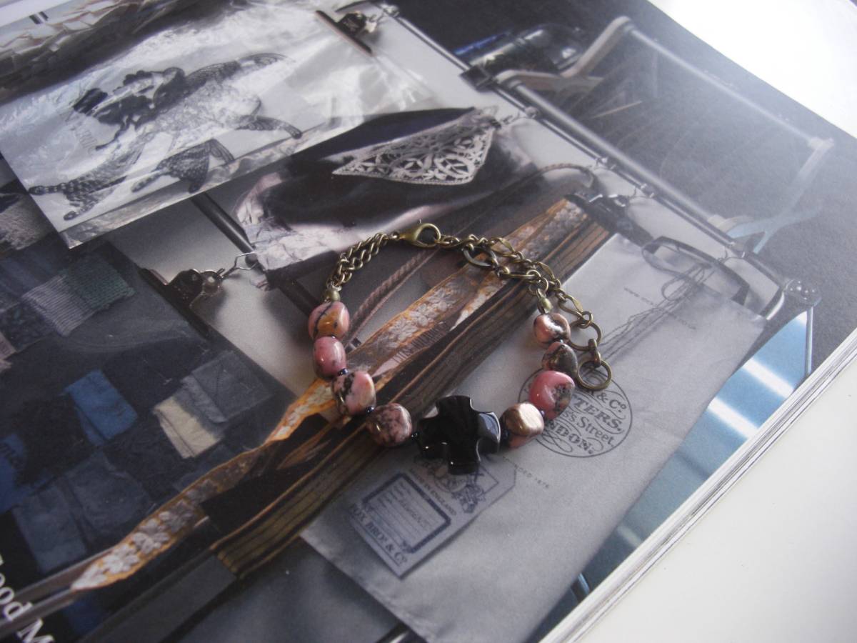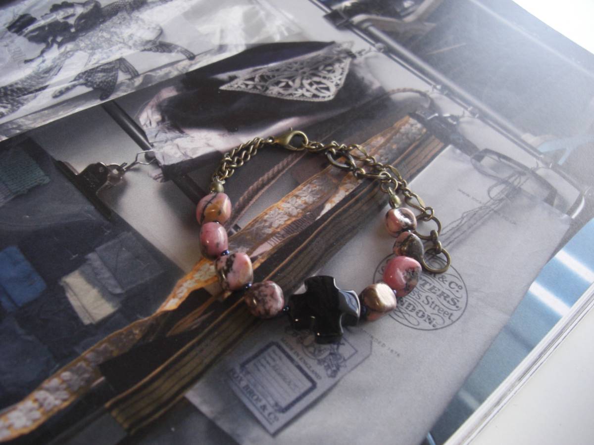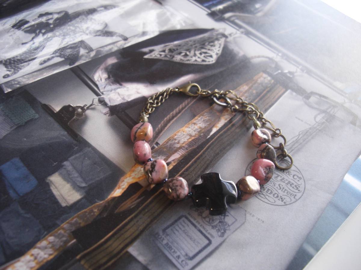 パンクを+して・・シリーズです♪秋色ピンクとクロス・・ロードナイトとオニキスのブレスレットです♪ダークピンクのロードナイトにオニキスのクロスを+し てシックな表情です♪8ミリから9ミリ位のロードナイトのタンブル、15ミリ位のオニキスクロスにデザインチェーンを合わせてさりげなくパンクしています ♪長さは全長23センチ位で調節自由です♪お揃いのネックレスやイヤリングも出品しています♪シンプルで飽きのこない いつまでも着けられるデザインを考えて作りまし た!ハンドメイドをご理解頂いてノークレーム、ノーリターンでお願いします