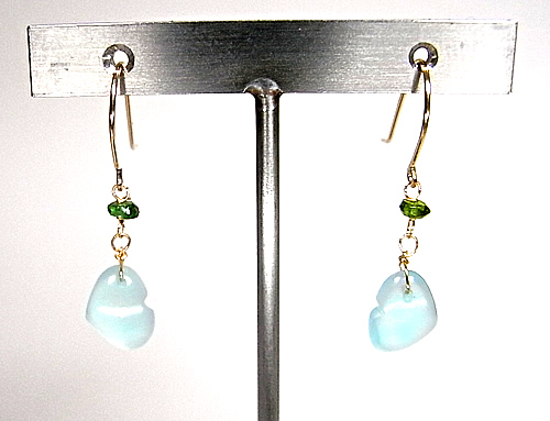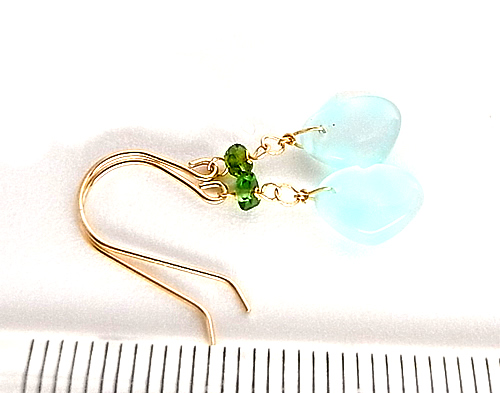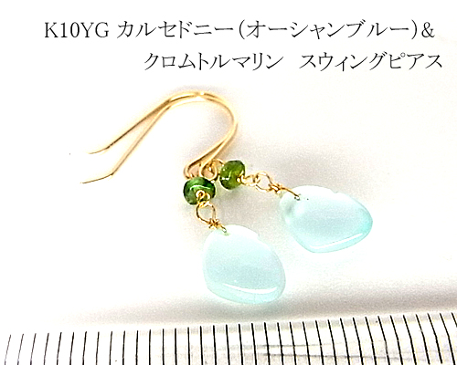 ダブルハートのオーシャンブルーカルセドニーとトルマリンのスウィングピアスです。新品在庫です。