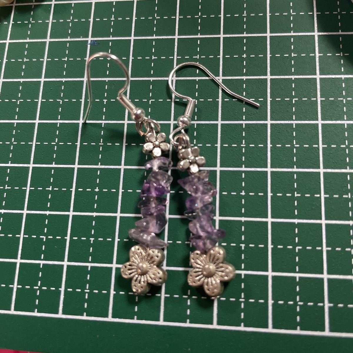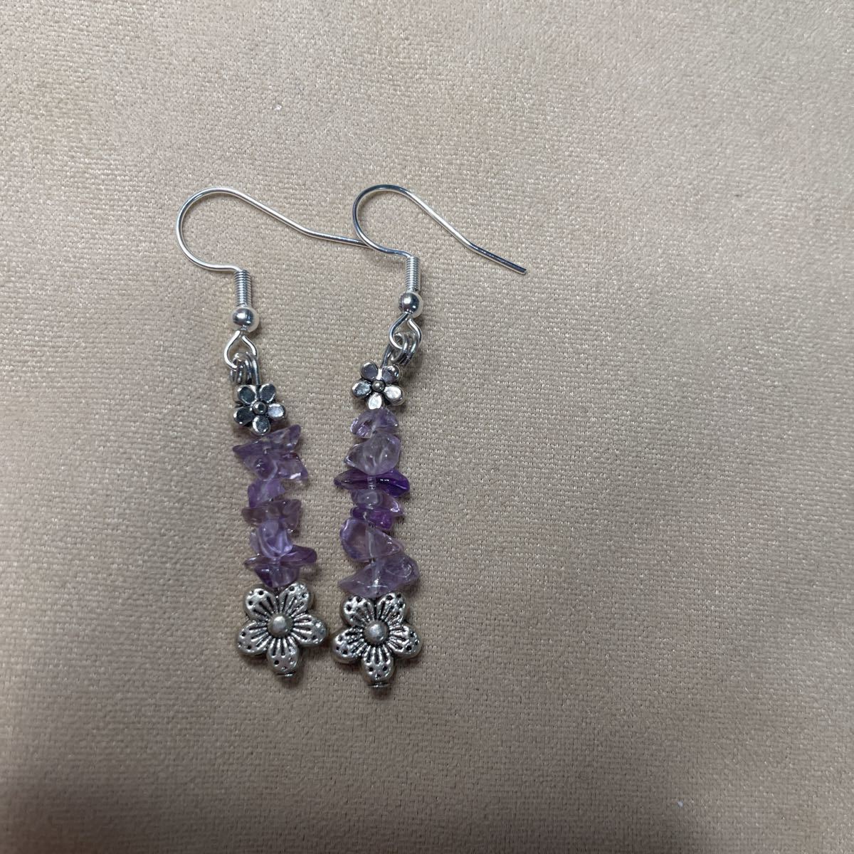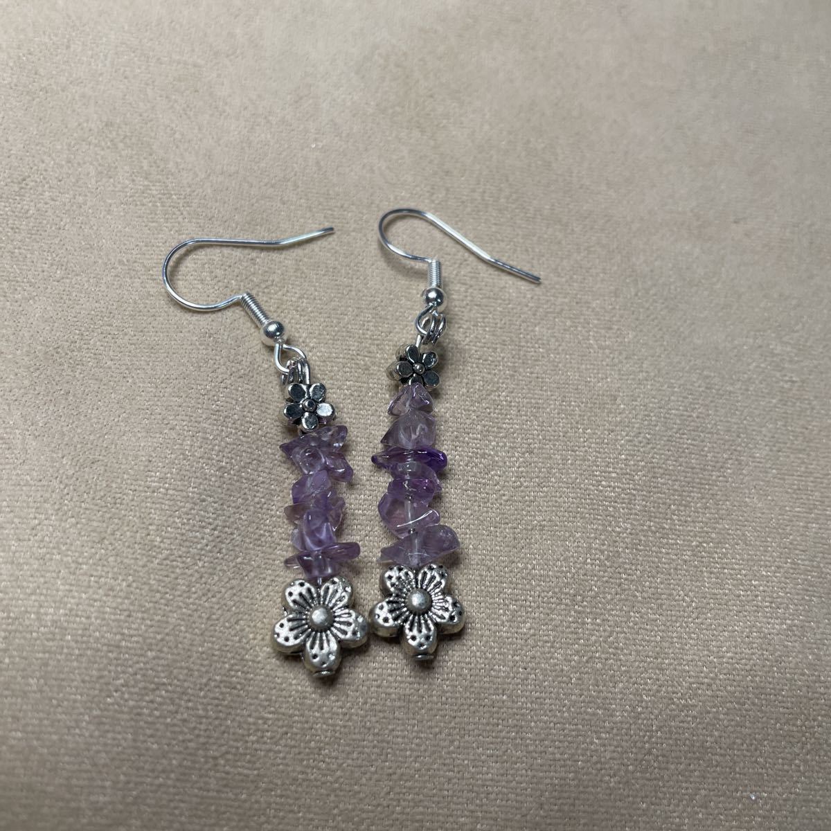 アメジストの細石とサクラを合わせました。とても可愛いです。フックはステンレスにプラチナメッキしたものを使用しております。