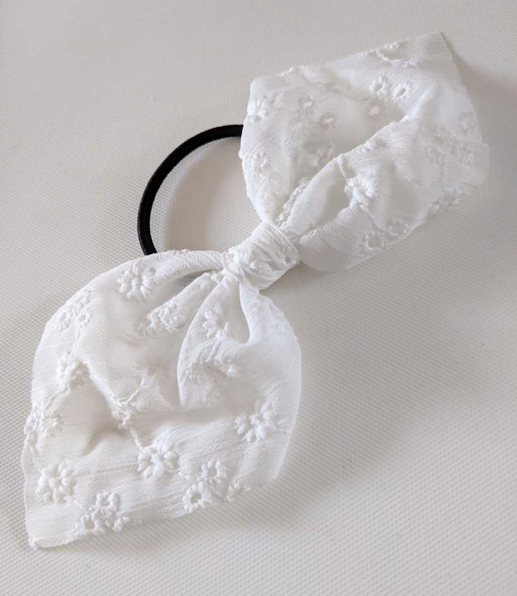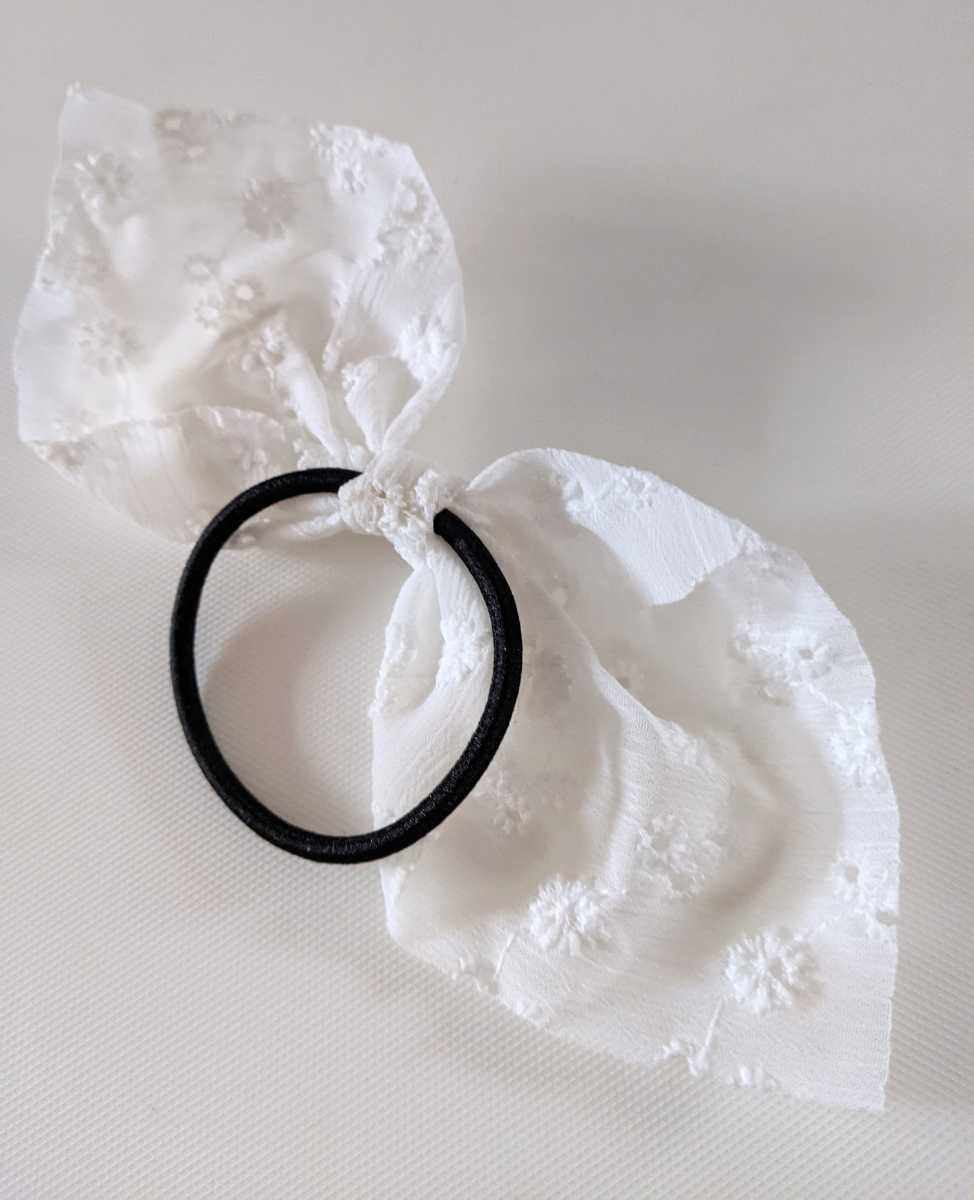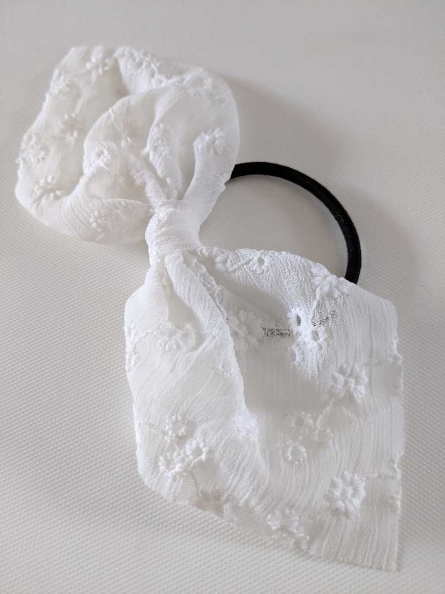 こちらは、大きめなホワイト 花柄刺繍 リボンヘアゴムになります♪