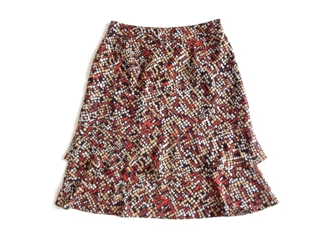sutseso スチェッソ ワールド 幾何学柄 ティアード スカート 40 日本製 茶 膝丈 シフォン L