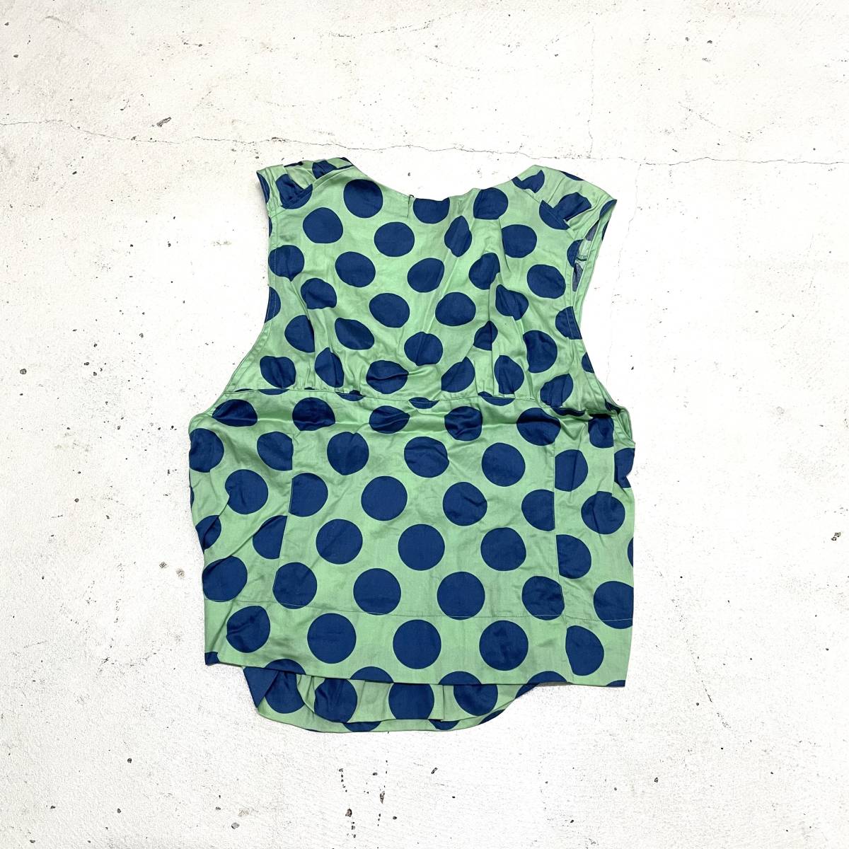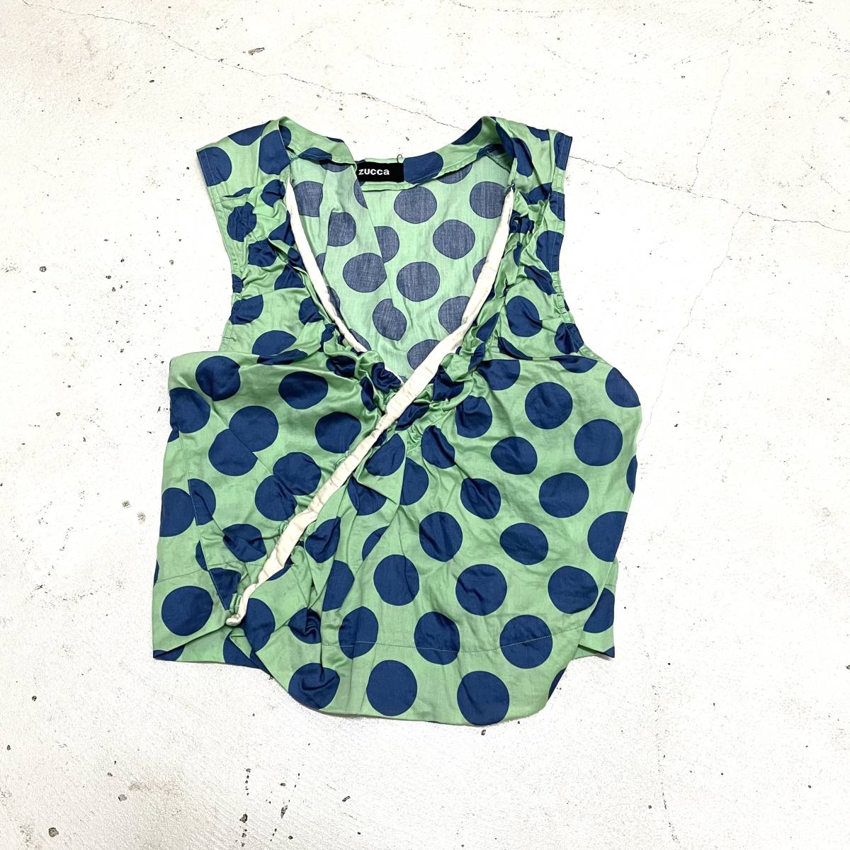 ズッカのサンプル品になります。 手書きの内タグが付いています。 ミントグリーンにブルーの大き目な水玉柄。 浴衣のような前が交差するタイプのブラウスです。 スナップボタン止め、たっぷりギャザーの入った立体感のあるシルエットです。 胸の開きが広いのでカラーのインナーを見せても良いですよ。 シャツのような生地です。 洗濯済みになります。お探しの方におすすめです。 | |||