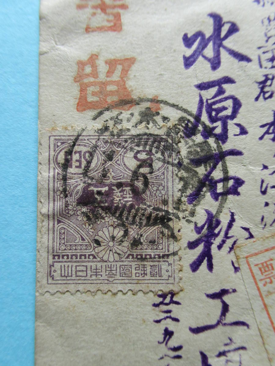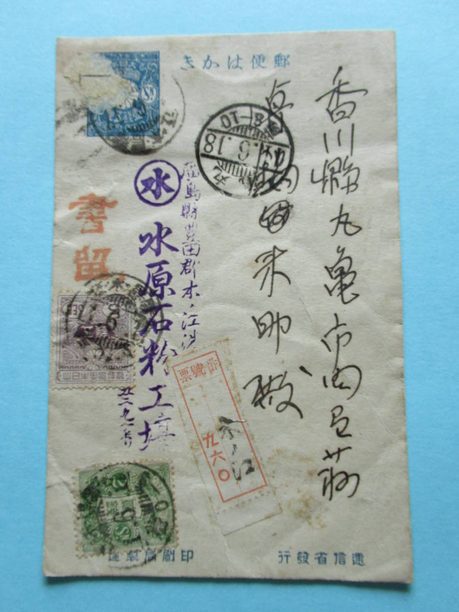 《分銅はがき・書留》 旧大正毛紙 5銭、2銭 櫛 広島・木ノ江 11.6.17 【島嶼・大崎上島】