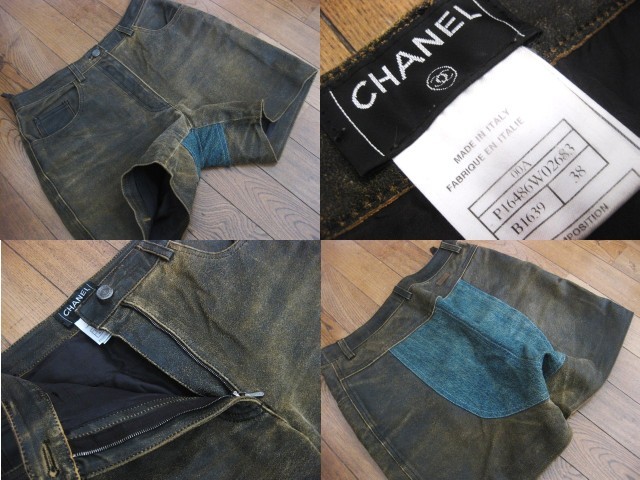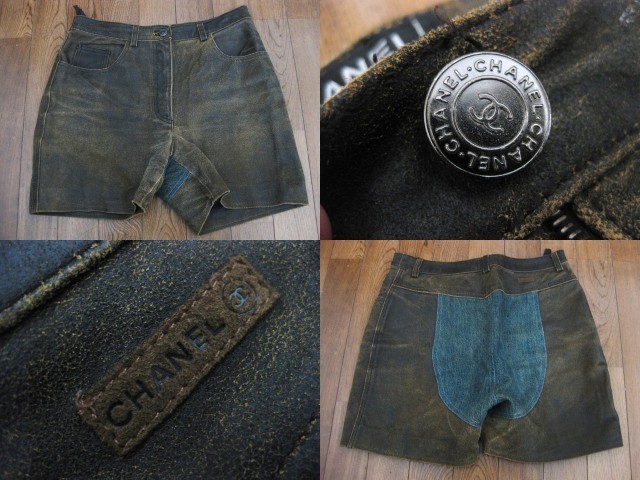 名作 本物 美品 高級 CHANEL シャネル レザー デニム ショートパンツ カーフ 革 ココマーク ロゴ 38