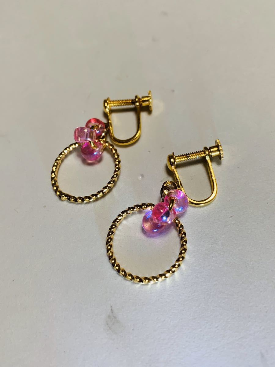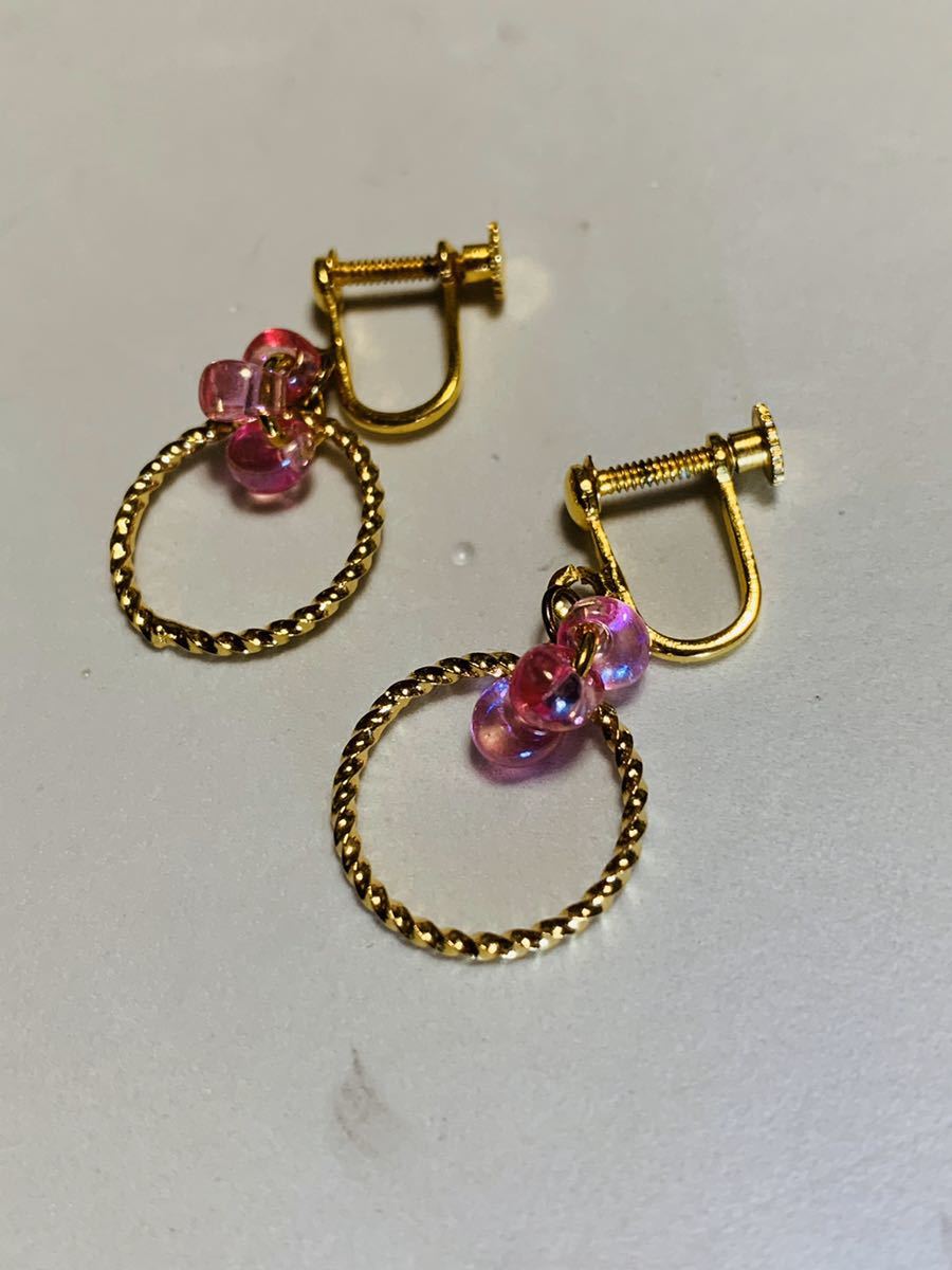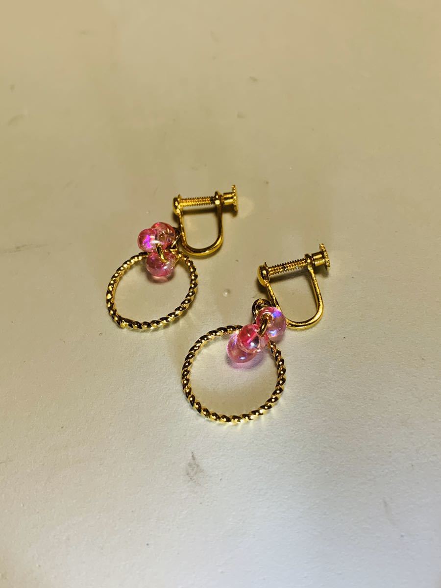 可愛い、ピンクの変わりビーズ、イヤリングてす、イヤリングトップのサイズは20×15ミリ、様式はネジ式です