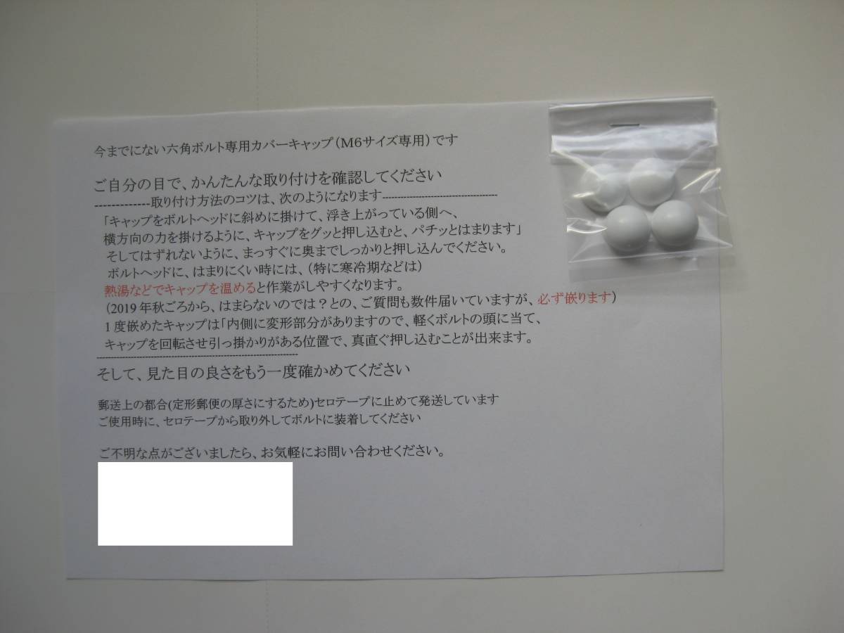 画像1枚目、市販のM6サイズ六角ボルトにCOVERCAP(白色)を装着した状態です
