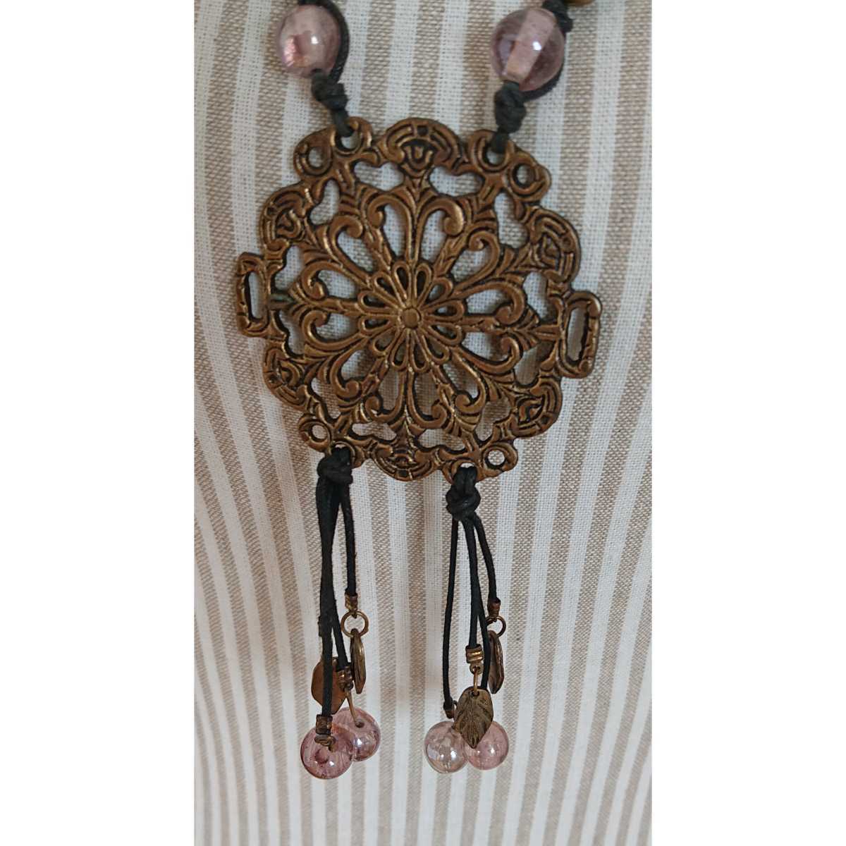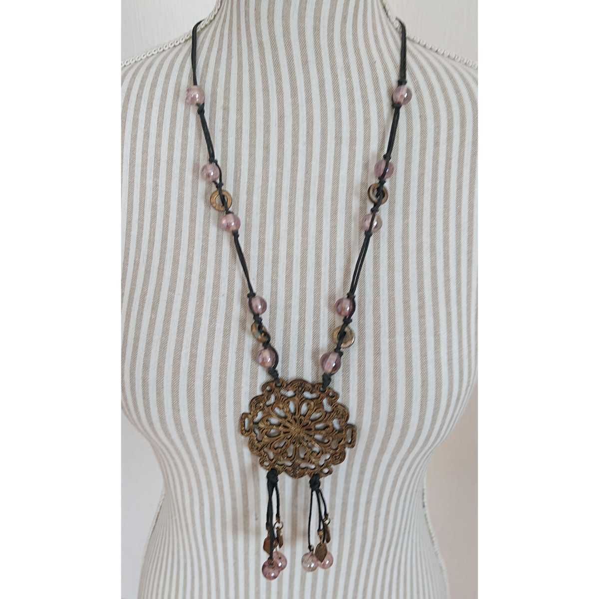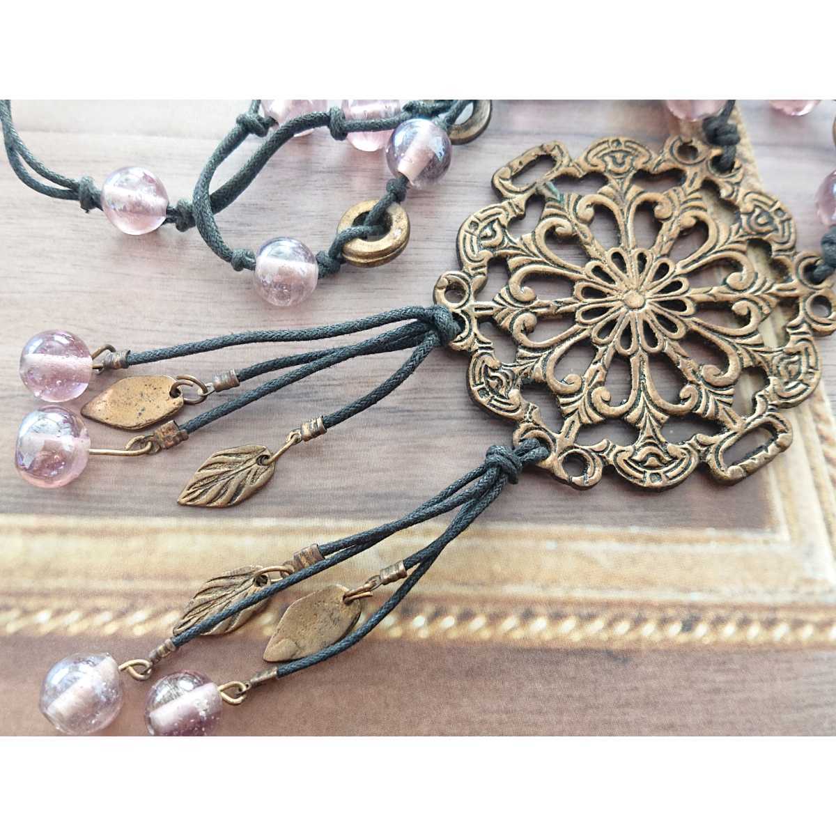 大きな透かし彫りモチーフ×ガラスビーズのロングネックレスです