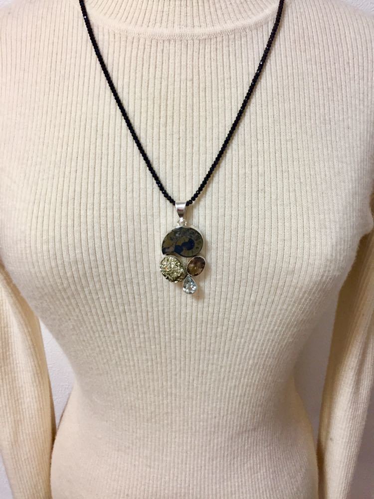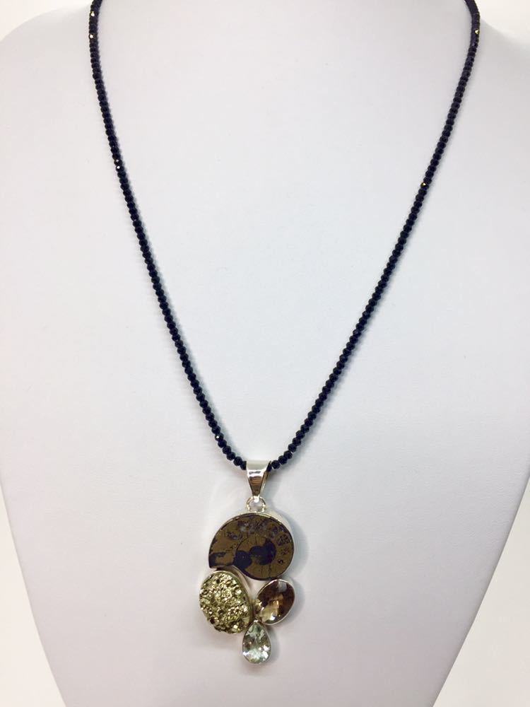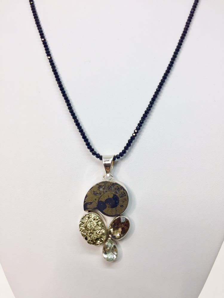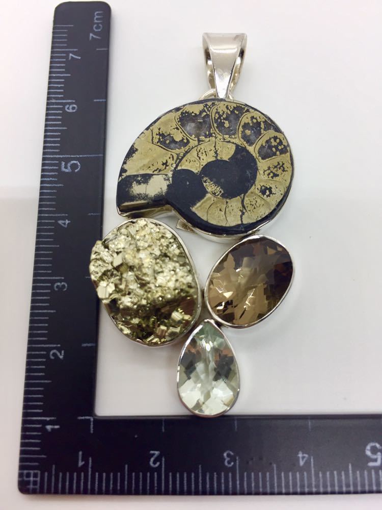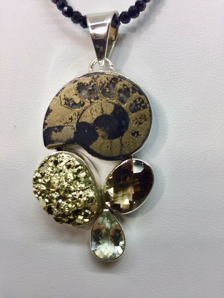 新品のアンモナイトとギベオン(隕石)、スモーキークォーツ、水晶を使用したペンダントです。