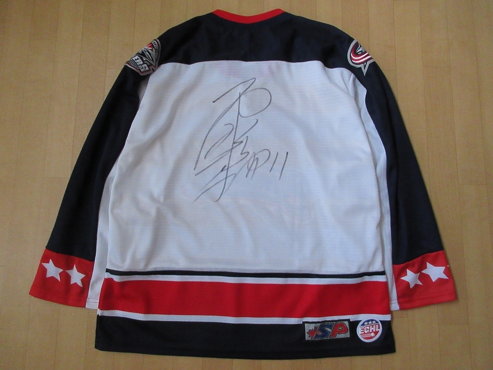 アメリカ・オハイオ州・デイトンにある屋内競技場「Nutter Center(ナッター・センター)」に本拠地を構える、「ECHL(East Coast Hockey League/イーストコースト・ホッケー・リーグ)」のチーム、〔Dayton Bombers(デイトン・ボンバーズ)〕の、ホッケーシャツ裏面に、「釧路緑ヶ岡高等学校(現・武修館高等学校)」から、「早稲田大学(Waseda University)」に進学し、2004年に「アジアリーグアイスホッケー(Asia League Ice Hockey)」の「日本製紙クレインズ(Nippon Paper Cranes(現・ひがし北海道クレインズ/East Hokkaido Cranes)」に入団し、2005~2007年まで「日本製紙クレインズ(Nippon Paper Cranes(現・ひがし北海道クレインズ/East Hokkaido Cranes)」、2008~「日本製紙クレインズ(Nippon Paper Cranes(現・ひがし北海道クレインズ/East Hokkaido Cranes)」に在籍し、2006年、2007年、2010年、2011年、2012年、2013年、2015年に「全日本アイスホッケー選手権大会」にて優勝、2006年-2007年、2008年-2009年、2013年-2014年に「Asia League Ice Hockey(アジアリーグアイスホッケー)」にて優勝、2007年1月28日~2月4日まで「中国(中華人民共和国/China)」の長春で開催された第6回アジア冬季競技大会「2007年アジア冬季競技大会(6th Asian Winter Games)」にて優勝(金メダル)、2011年1月30日~2月6日まで「カザフスタン共和国」のアスタナ(現・ヌルスルタン)及びアルマトイで開催された第7回アジア冬季競技大会「2011年アジア冬季競技大会(Seventh Asian Winter Games)」で銀メダル、2017年2月18日~2月26日に日本の北海道札幌市及び帯広市で開催された第8回アジア冬季競技大会「2017年アジア冬季競技大会(Eighth Asian Winter Games)」で銅メダルに輝き、2010年の「バンクーバーオリンピック(XXI Olympic Winter Games Vancouver)」、2014年の「ソチオリンピック(XXII Olympic Winter Games Sochi)」、2018年の「平昌オリンピック(XXIII Olympic Winter Games PyeongChang)」の予選において中心選手の一人にして、2007~2008年の一年間〔Dayton Bombers(デイトン・ボンバーズ)〕に在籍した、日本が誇るアイスホッケー選手「西脇雅仁(Masahito Nishiwaki)」選手のサインが施された、「SP Apparel(エスピーアパレル)」社製の、カナダ製〔SP Apparel製・西脇雅仁選手サイン入り・ホッケーシャツ〕になります。