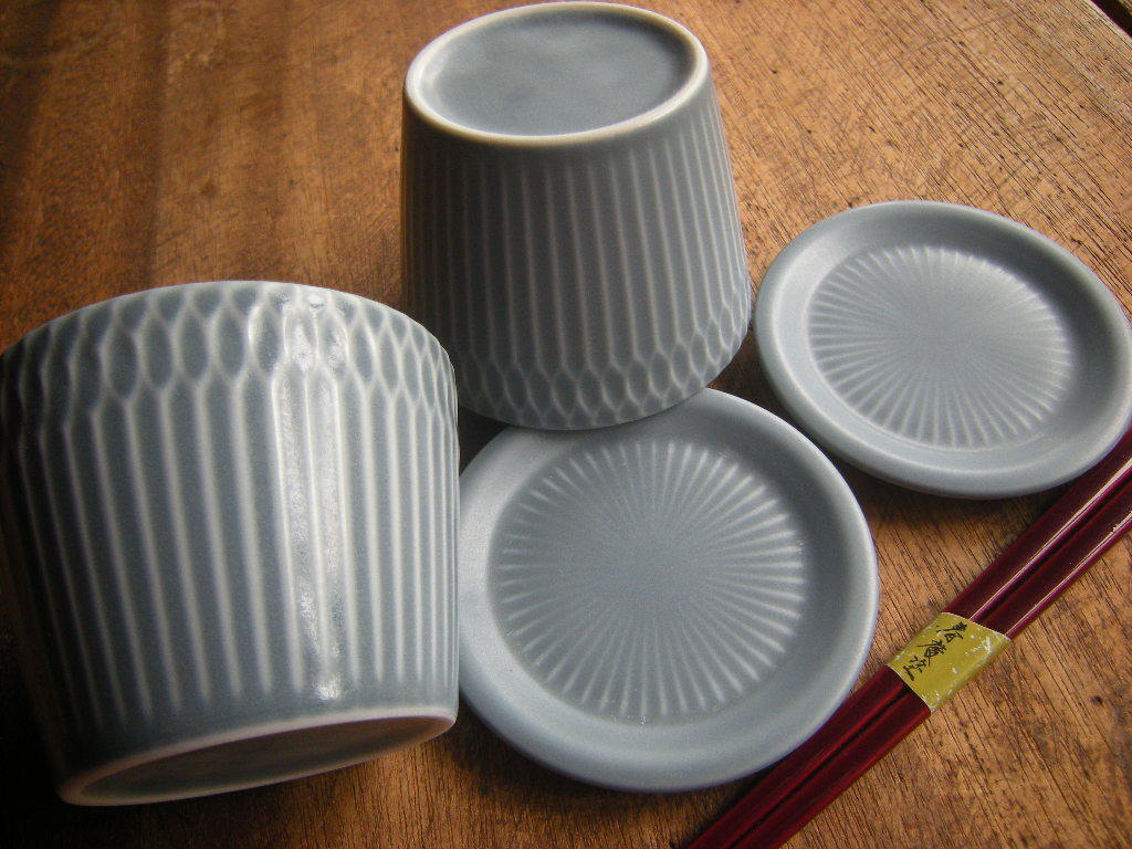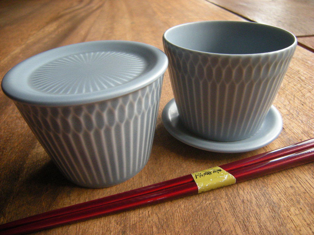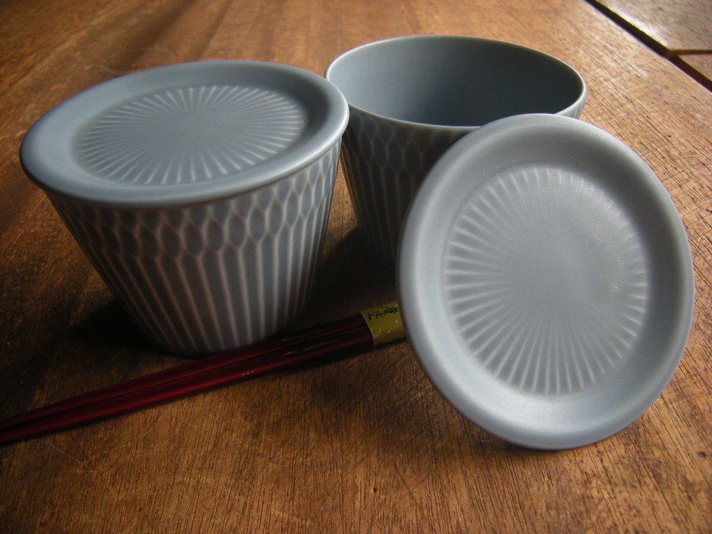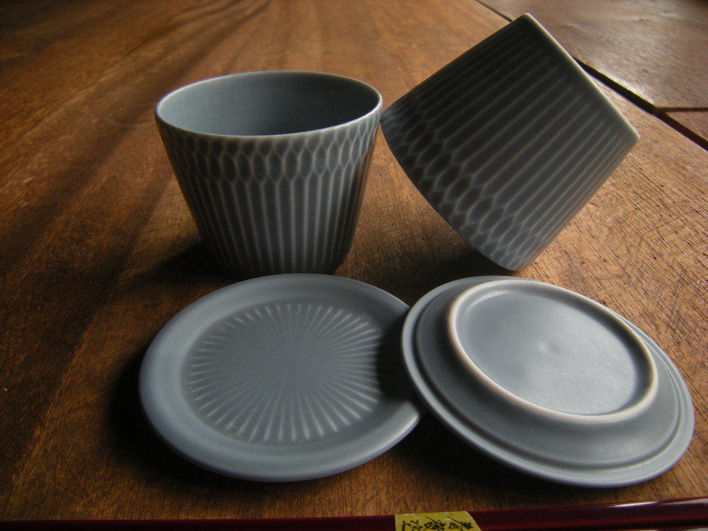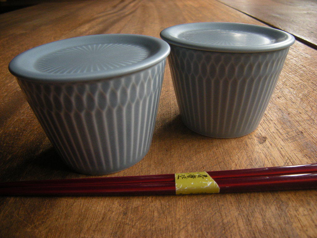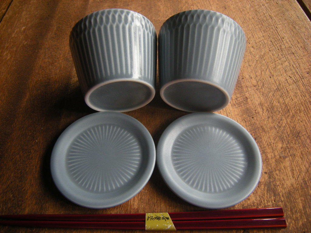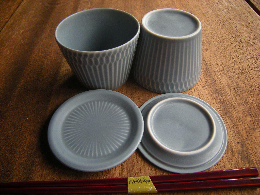 小◎美濃焼【新品・未使用】ブルーグレー 千段さざなみ 蓋付 カップ(8.7㎝x6.7㎝ 9㎝x1㎝)1組セット *カフェうつわ*高級器*