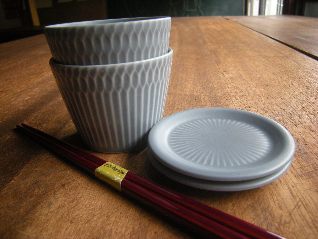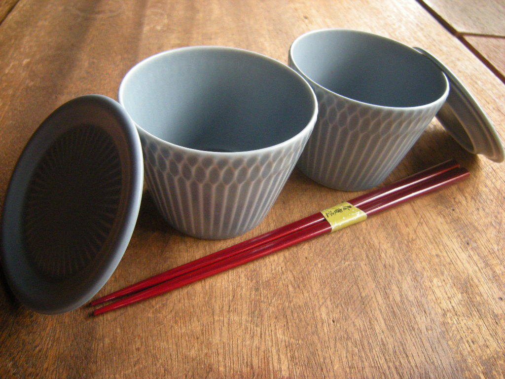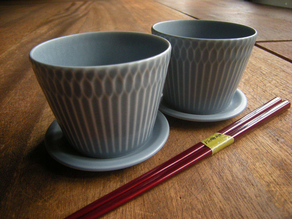 小◎美濃焼【新品・未使用】ブルーグレー 千段さざなみ 蓋付 カップ(8.7㎝x6.7㎝ 9㎝x1㎝)1組セット *カフェうつわ*高級器*
