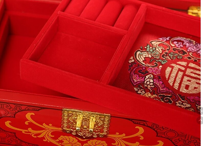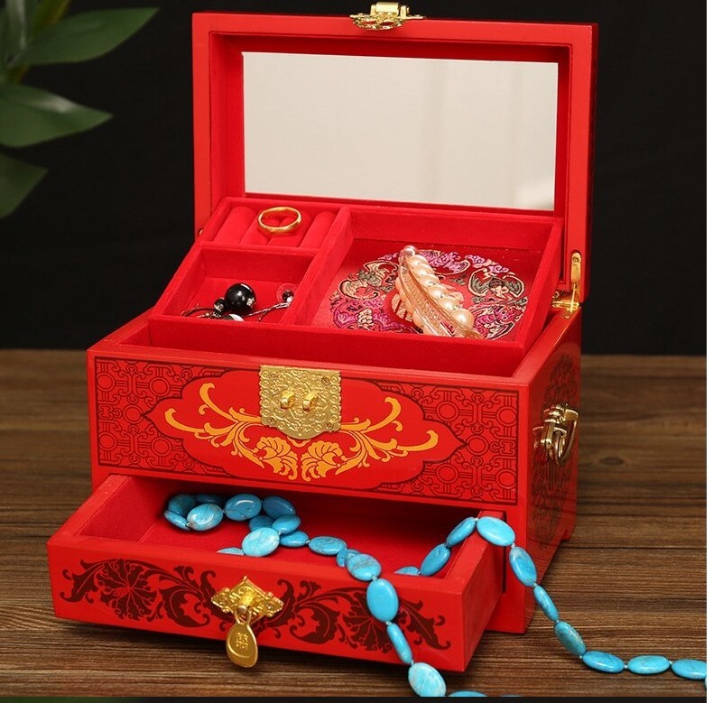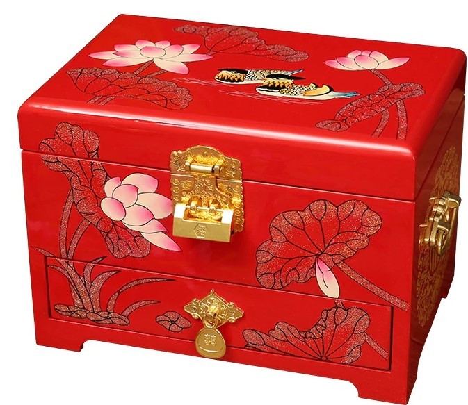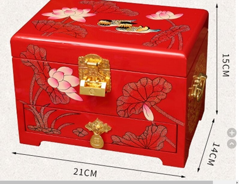 木製漆器21 × 15 × 14㎝ 中国製古典系赤ボックス2層ジュエリーボックス おしゃれ