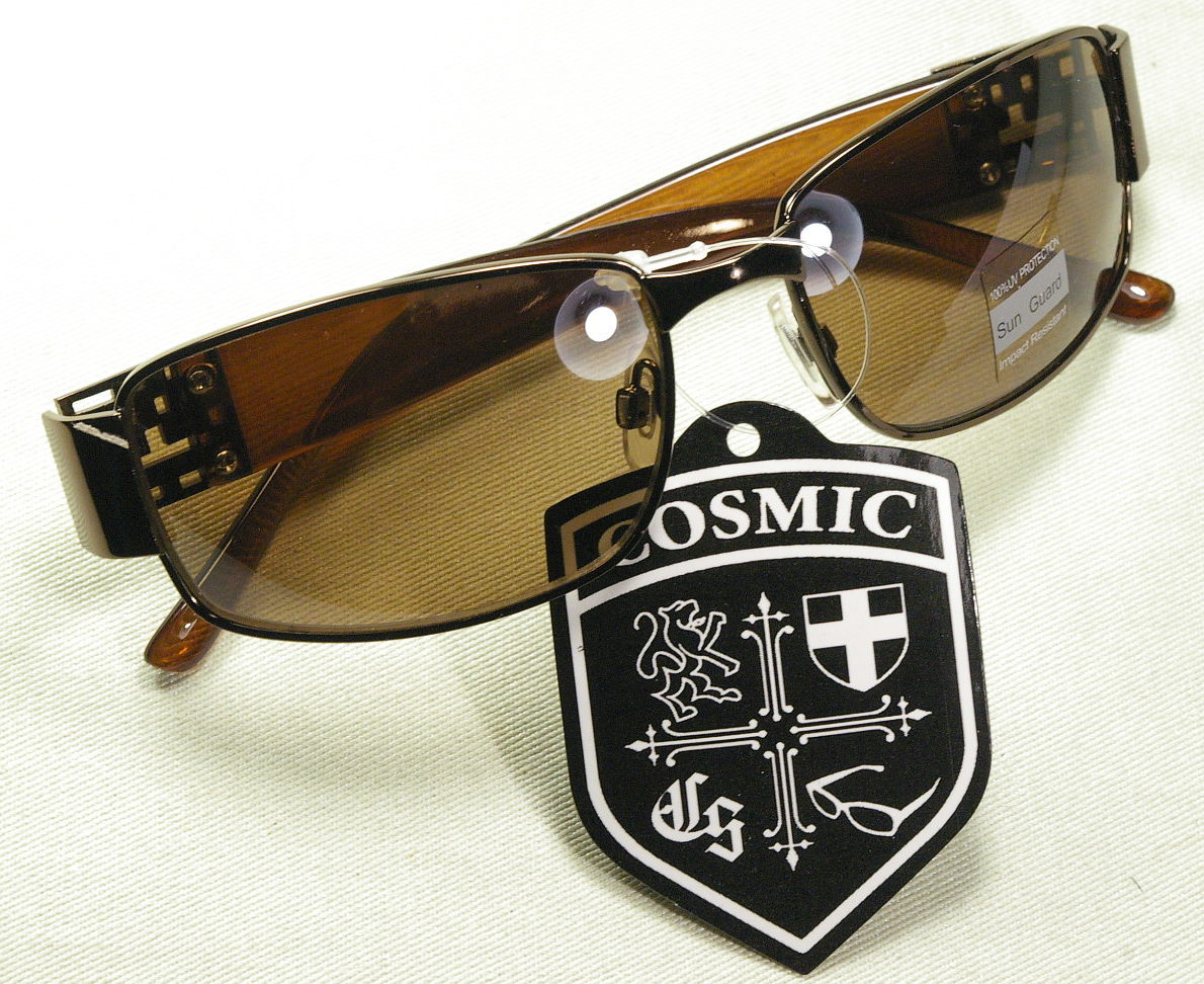 スクエアなブロンズフレームに茶色レンズ、プラスティックの幅広テンプル。丁番の装飾的デザインが印象的です。