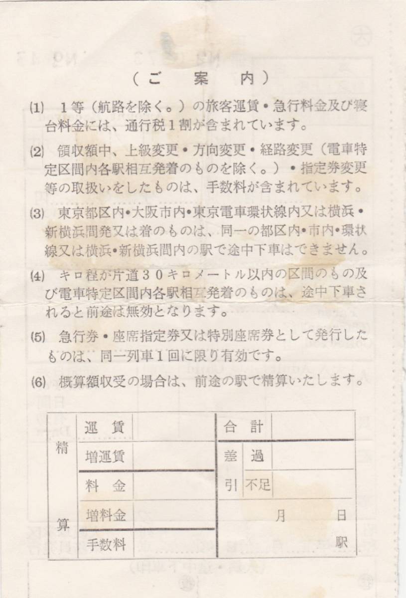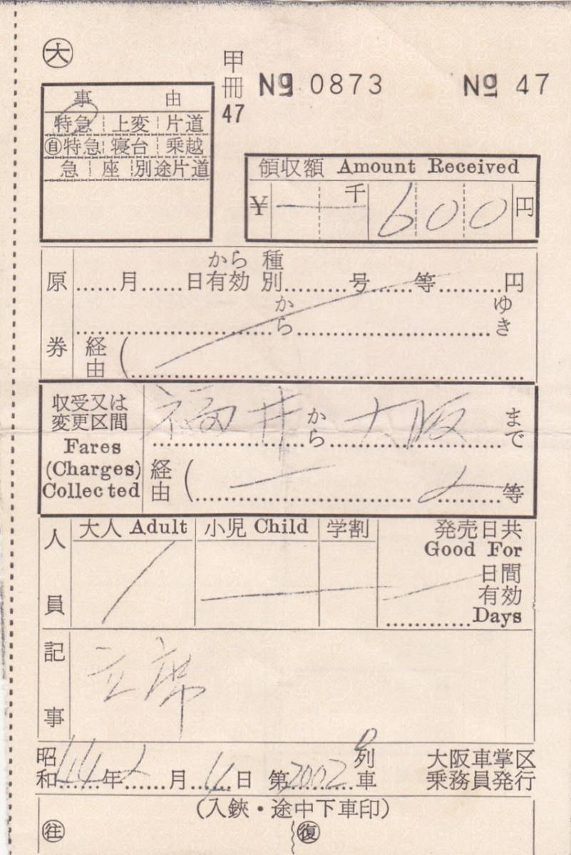【国鉄】大阪車掌区乗務員発行 第一種車内補充券 S44 元号記載あり