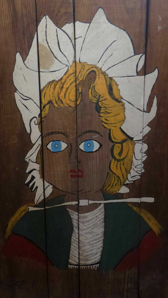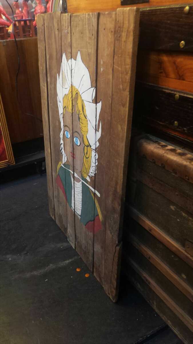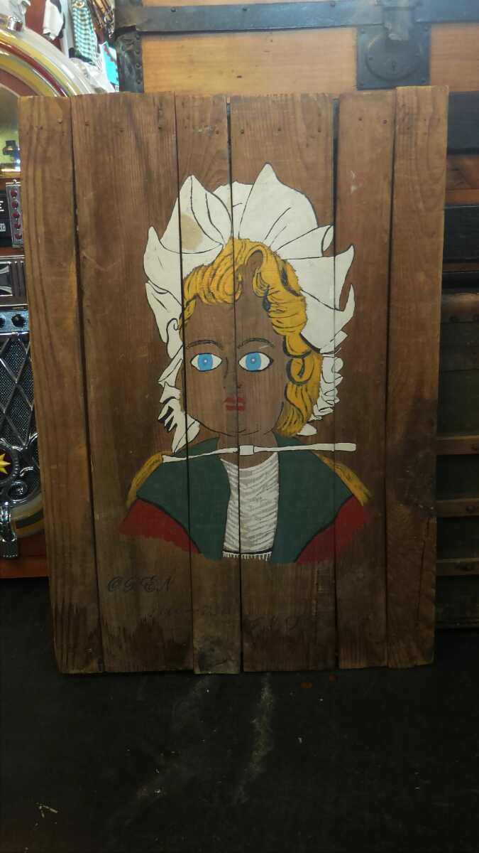 コロラドのアンティークショップにて購入したもので古い木材に描かれた金髪の女性のデザインが独特な雰囲気あってオシャレな一品です