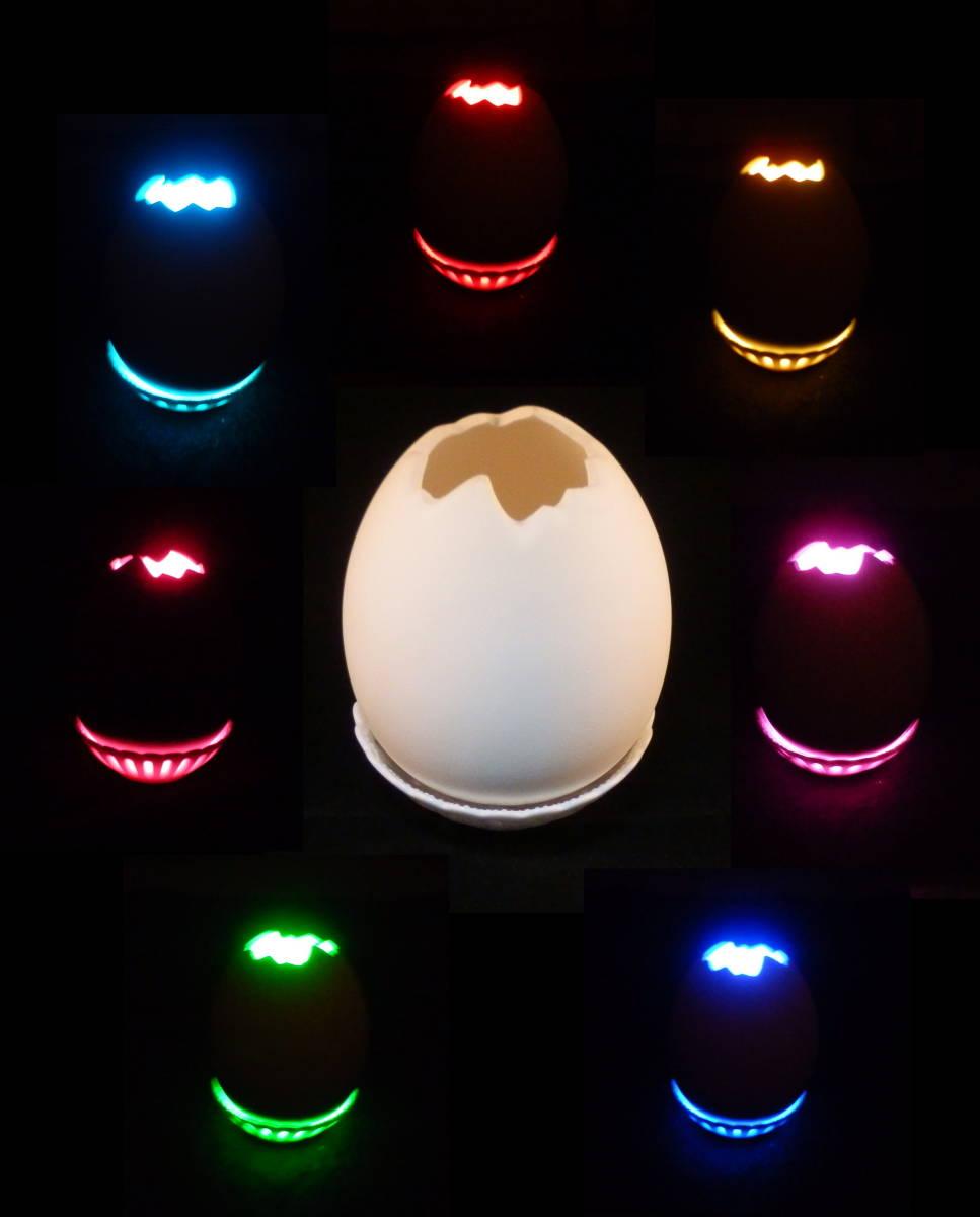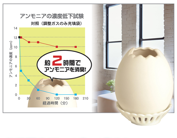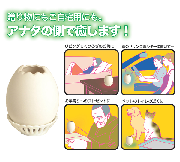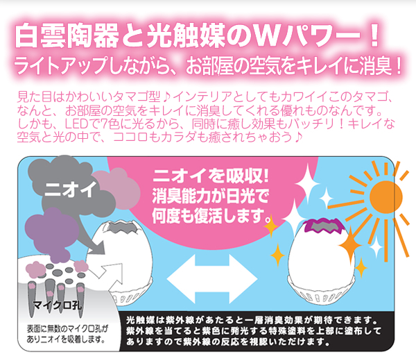 【白雲陶器 と 光触媒 のパワーで 消臭 7色に光るセラミック卵】ライトアップしながら、お部屋の空気をキレイに消臭●5つの特徴1.多孔質の白雲陶器でニオイが取れます。2.光触媒加工で、一層消臭効果が期待できます。3.7色+レインボー色のLEDの光が磁器からやさしくこぼれ、あなたを幻想的に癒やします。4.紫外線を当てると発光する特殊塗料を塗布してあります。光触媒反応に必要な紫外線を確認できて安心です。5.消臭能力が日光で何度も復活。フィルターの交換も不要で、半永久的にお部屋の空気をきれいにします。