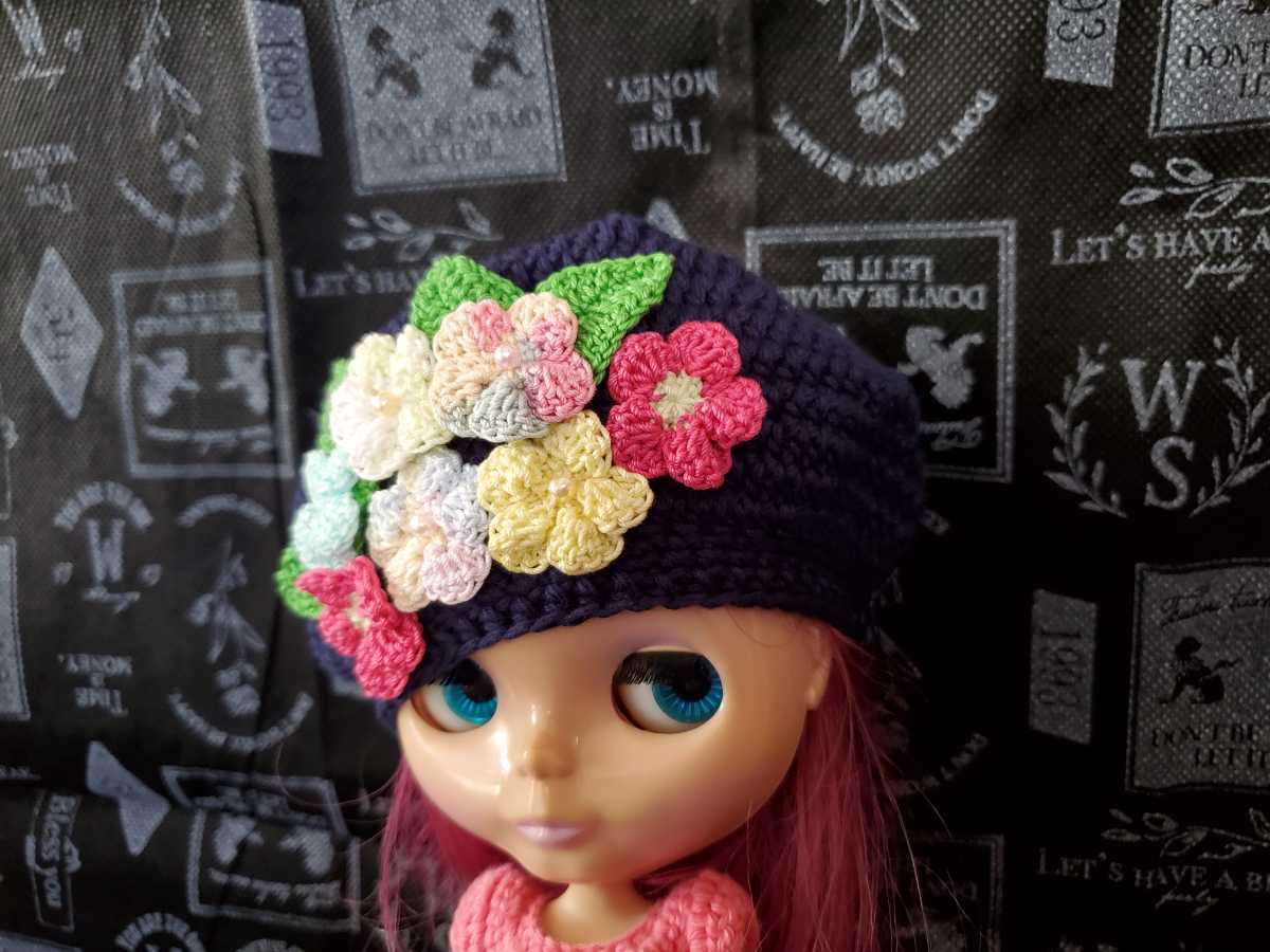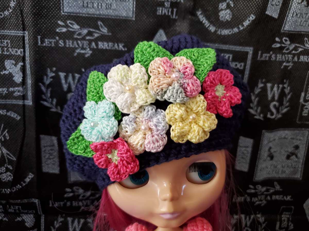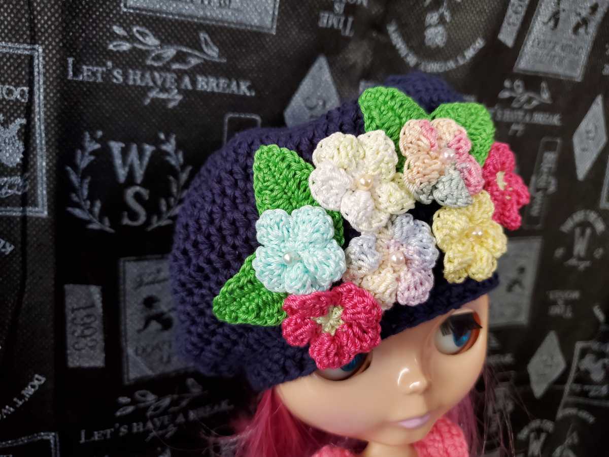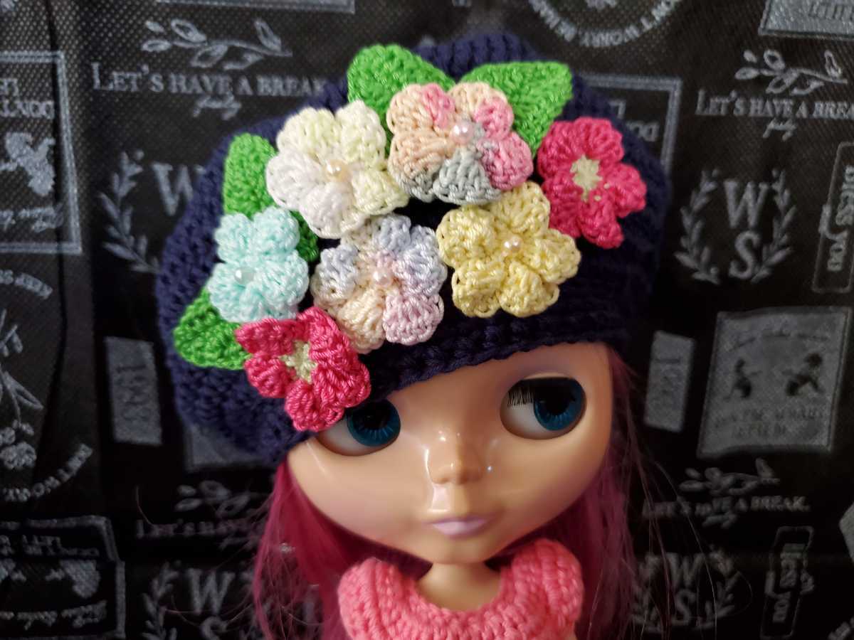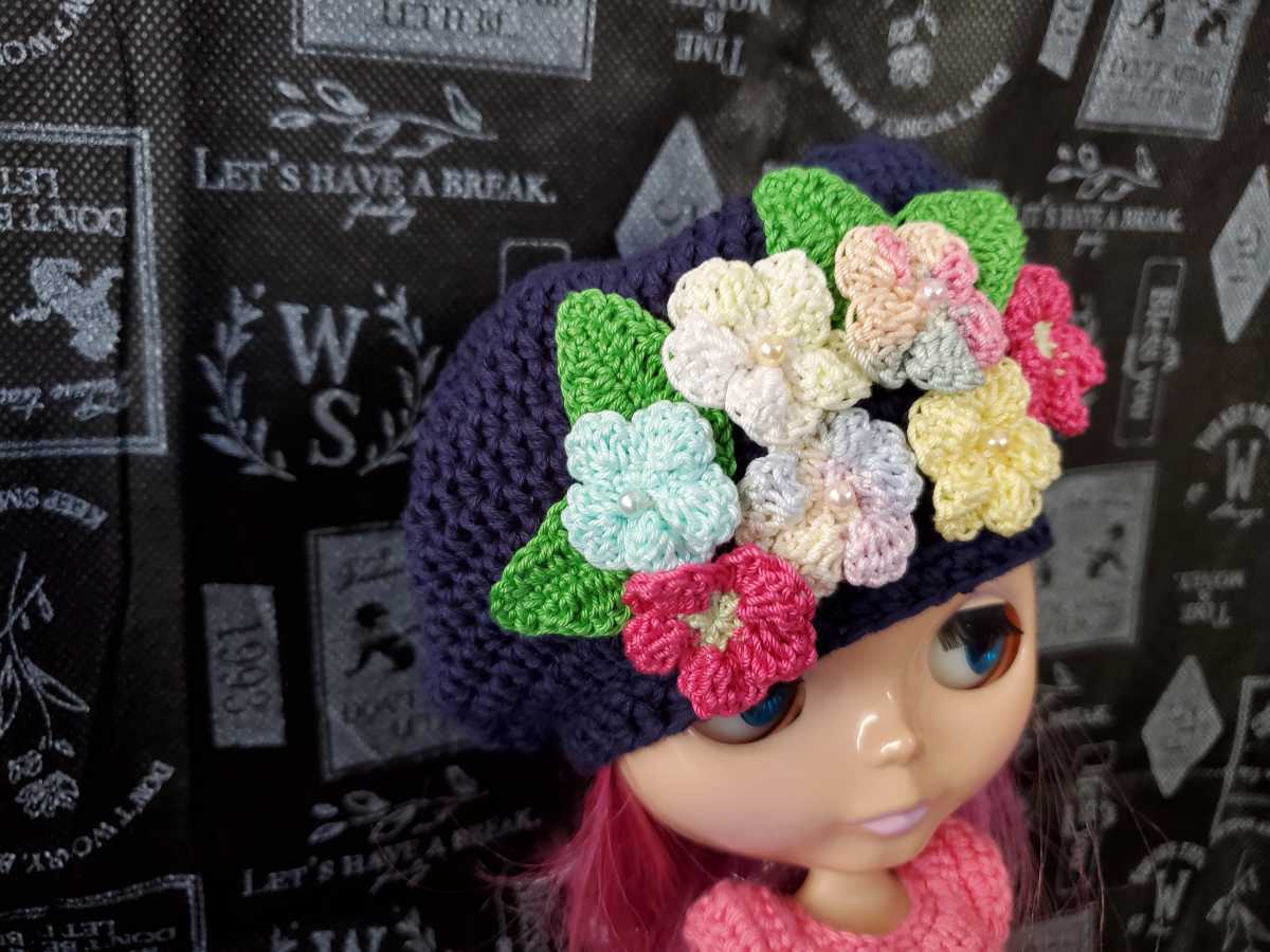 ブライス☆アウトフィット☆ベレー帽☆1点☆帽子(*^_^*)お花畑☆ダークブルー