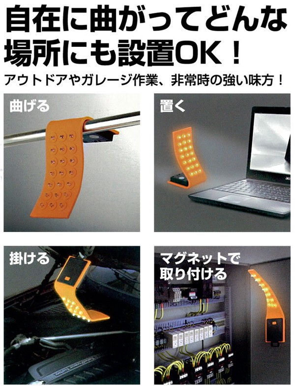 | 商品情報 | 商品の説明 自在に曲がってどんな場所にも設置OK! マグネット付なので金属面にも取付可能OK! 防水規格IPX4適合品なので雨天時の仕様もOK! 【仕様】 サイズ:W75×D20×H325mm 材 質:シリコン、ABS樹脂、スチール他 点灯モード:1/3点灯・全点灯・全点滅・消灯の4種類 LED30灯/最大180ルーメン 連続点灯時間 (約) 10時間 (目安) 使用電池:単四×3本(別売) |