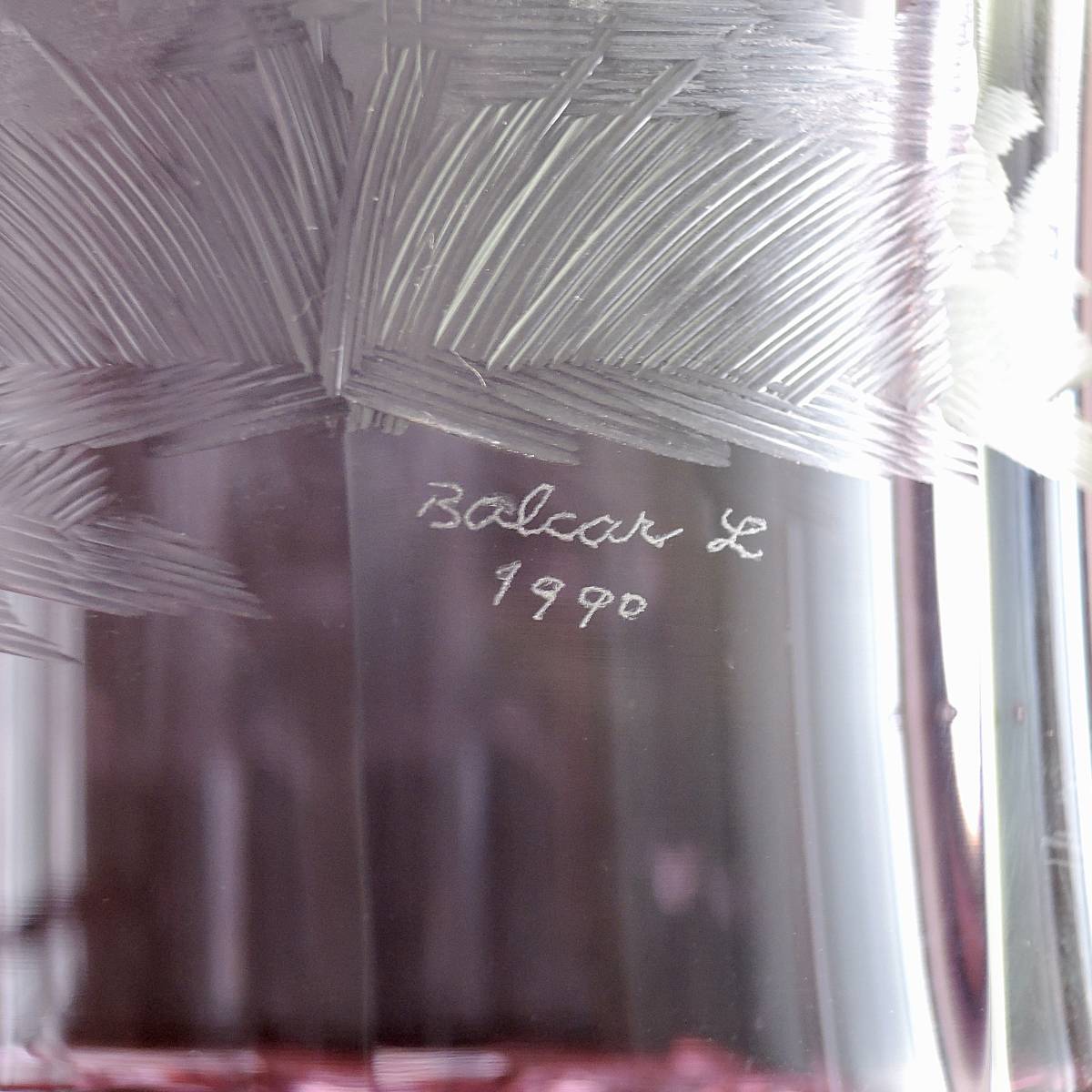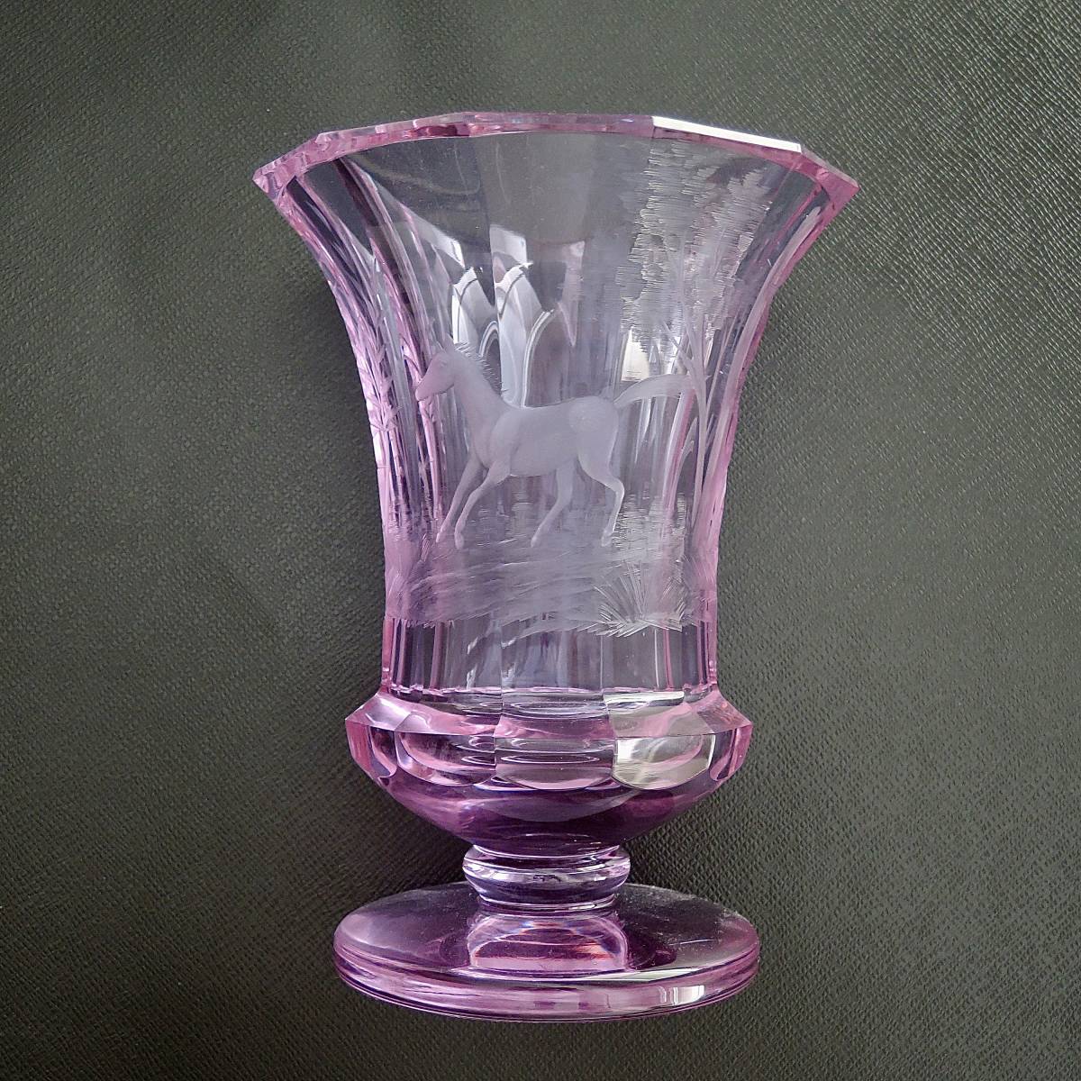 ■美品■1990年製 Ludek Balcar for Moser オールド モーゼル フラワーベース ホースエッチング パープル 花瓶