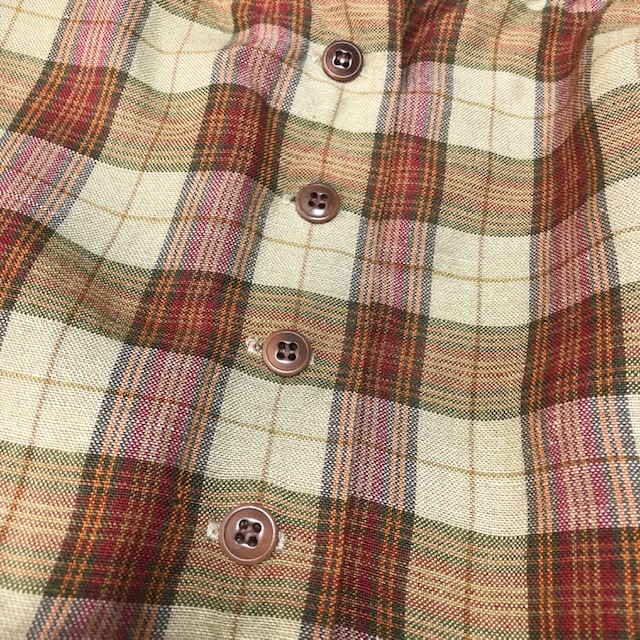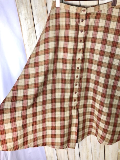 ●商品説明・・・アメリカ買い付け品になります。70年代頃のヴィンテージのリネンとレーヨン生地のチェック柄のロングフレアスカートです。made in USAです。ボタン開きになっています。素材はリネン50%、レーヨン50%で、落ち着きのあるアースカラーです。