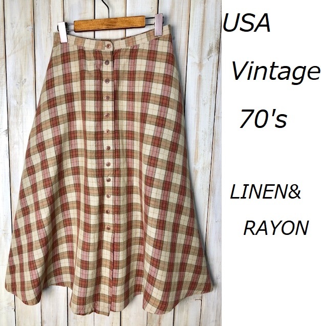 USA古着 70's USA製 ヴィンテージ リネン×レーヨン チェックロングスカート 6  アメリカ古着 レトロ オールド ●36