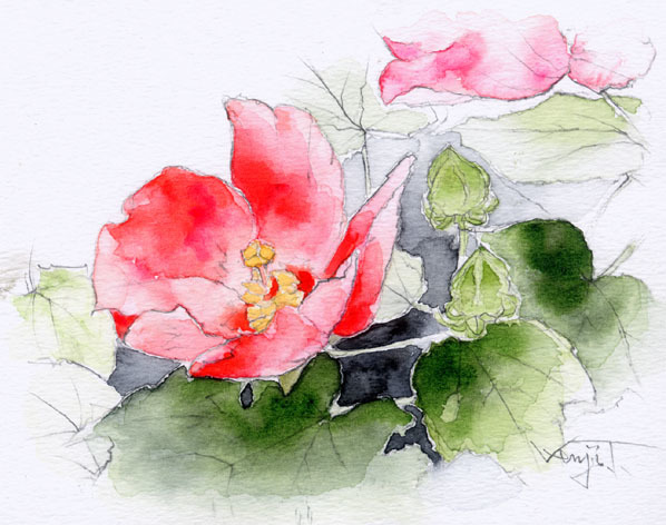 芙蓉(フヨウ)は夏の花のはず ところが秋深まったこの時季 道端に見かけた 「芙蓉」は「美しい人のたとえ」に用いられる花 しとやかな顔立ちのことを「芙蓉の顔」という 花のほうは朝咲いて 夕方にはしぼんでしまう (絵・文 / 田中 健二 昭和8年生まれ)
