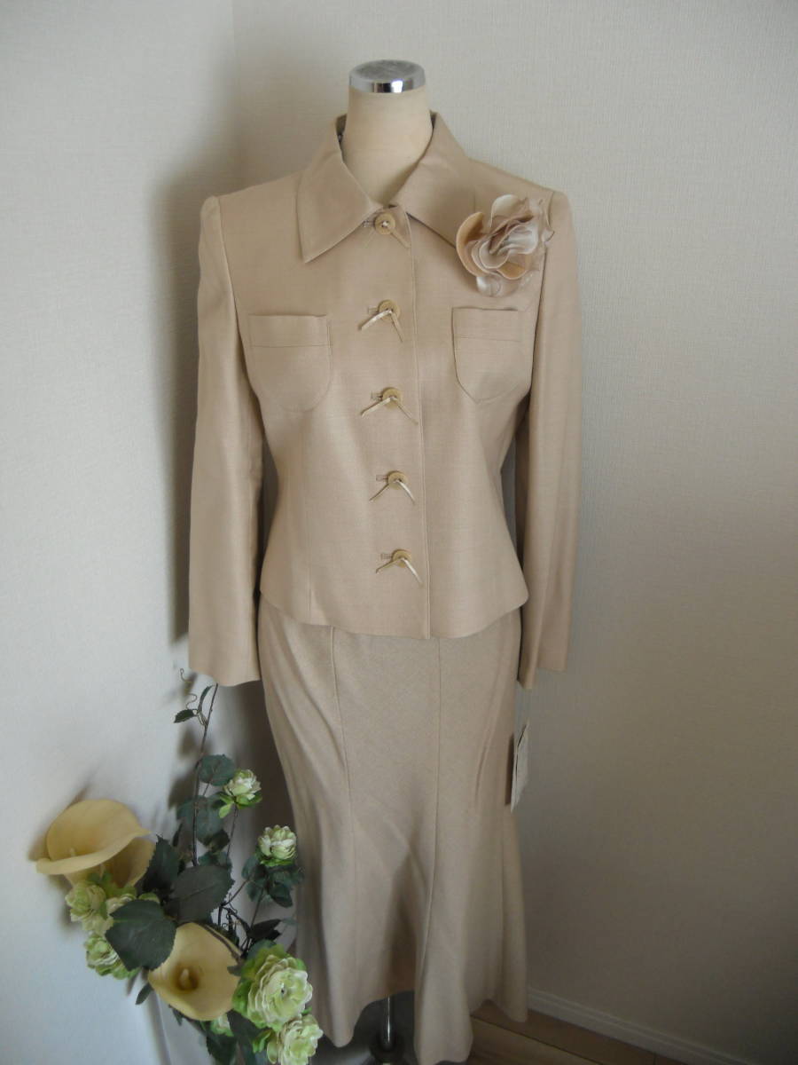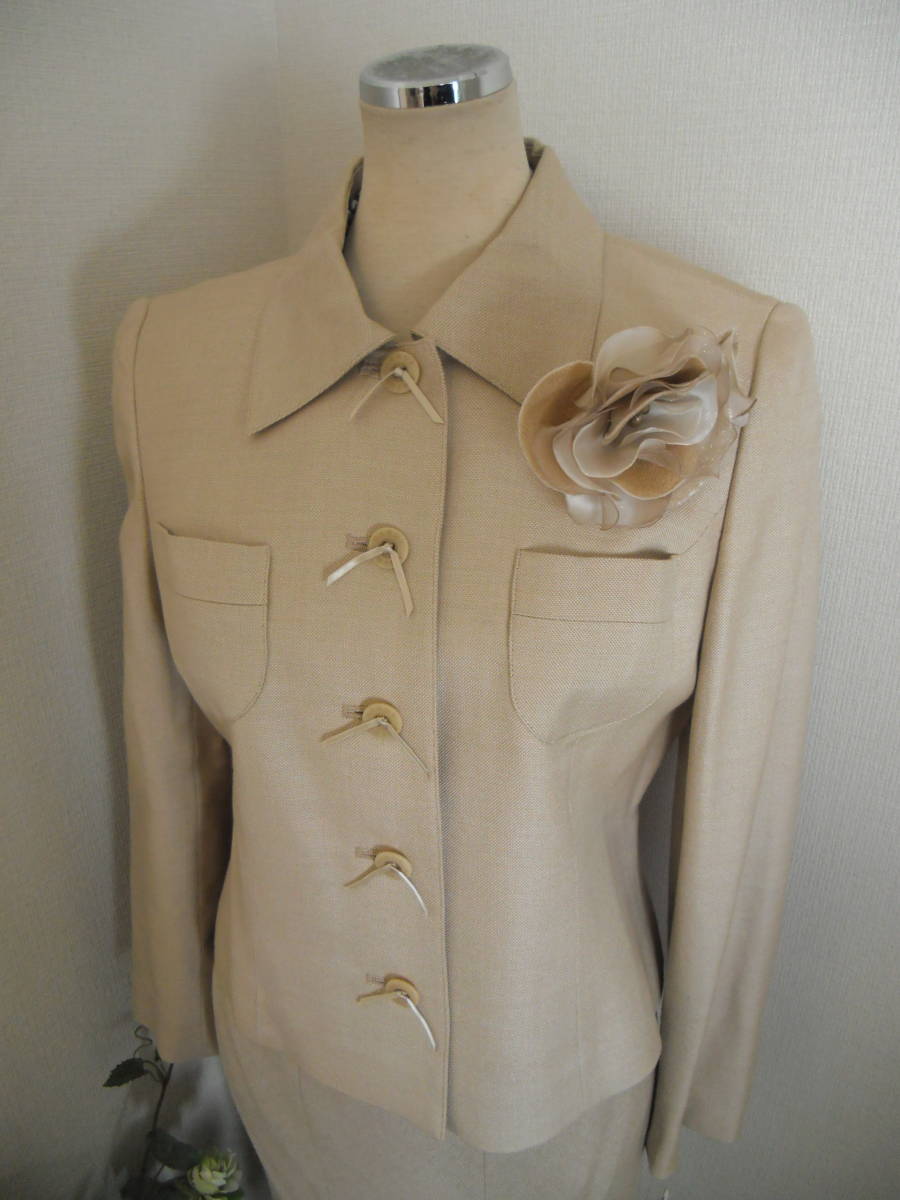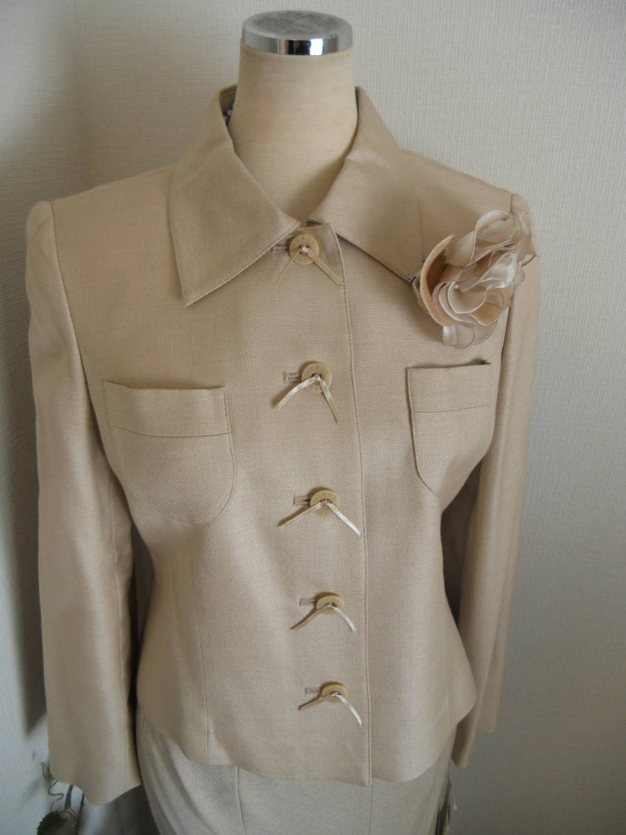 Hardy Amies、ご入園、ご入学の慶事にも最適なかっちり上品なプレタスーツでございます。こちらでしたら年齢を問わずお召し頂けるスーツかと存じます。ボタンにはリボン飾りとHardy Aimesのロゴが刻まれております。素材はウール62、シルク38%でございます。定価はジャケット6万9000円、スカート3万3000円でございます。おサイズは9号。ジャケットの肩幅39、身幅46、袖丈58、着丈54、スカートウエスト66、ヒップ98(4枚はぎフレア)、スカート丈85センチでございます。(素人採寸ですので若干の誤差はお許し下さい)