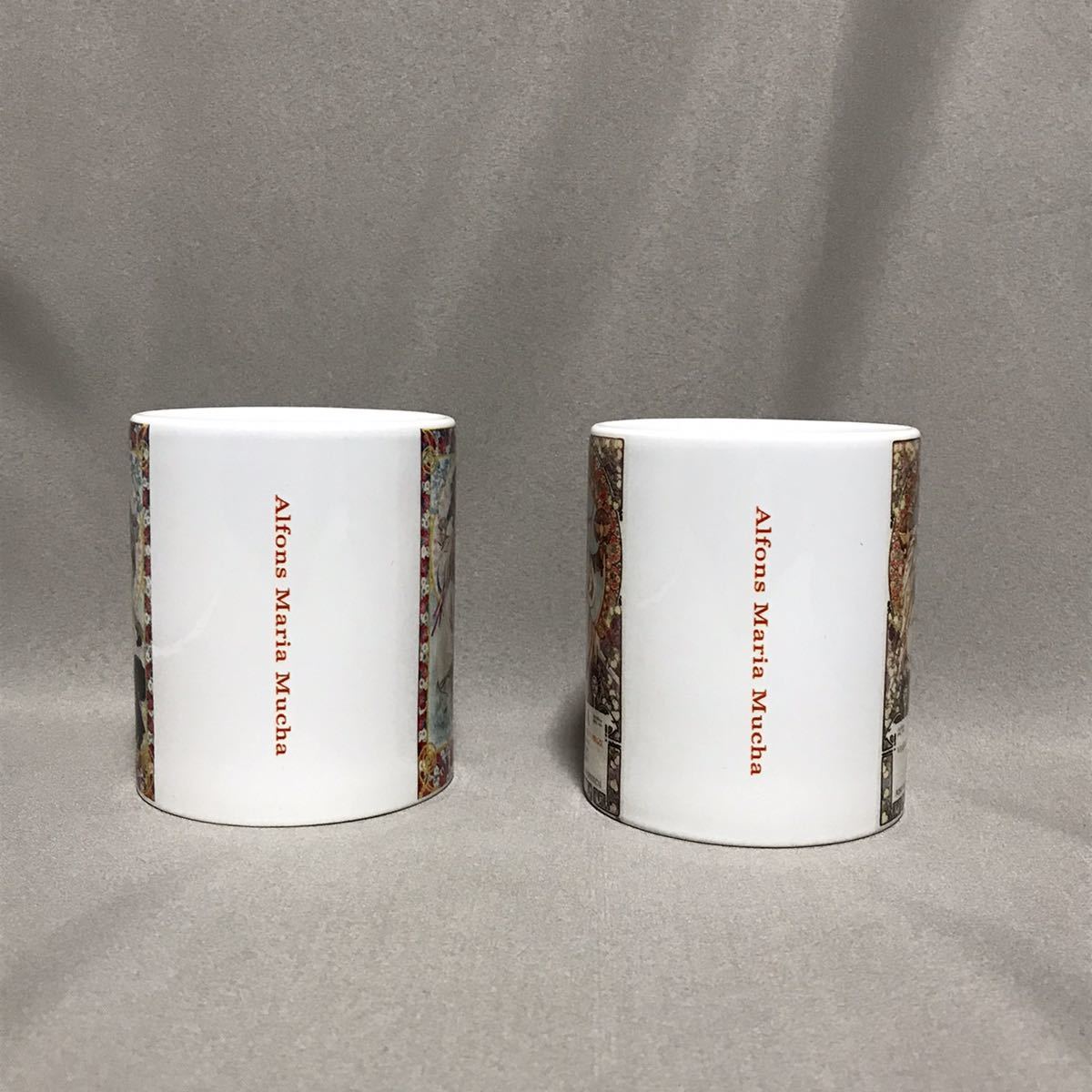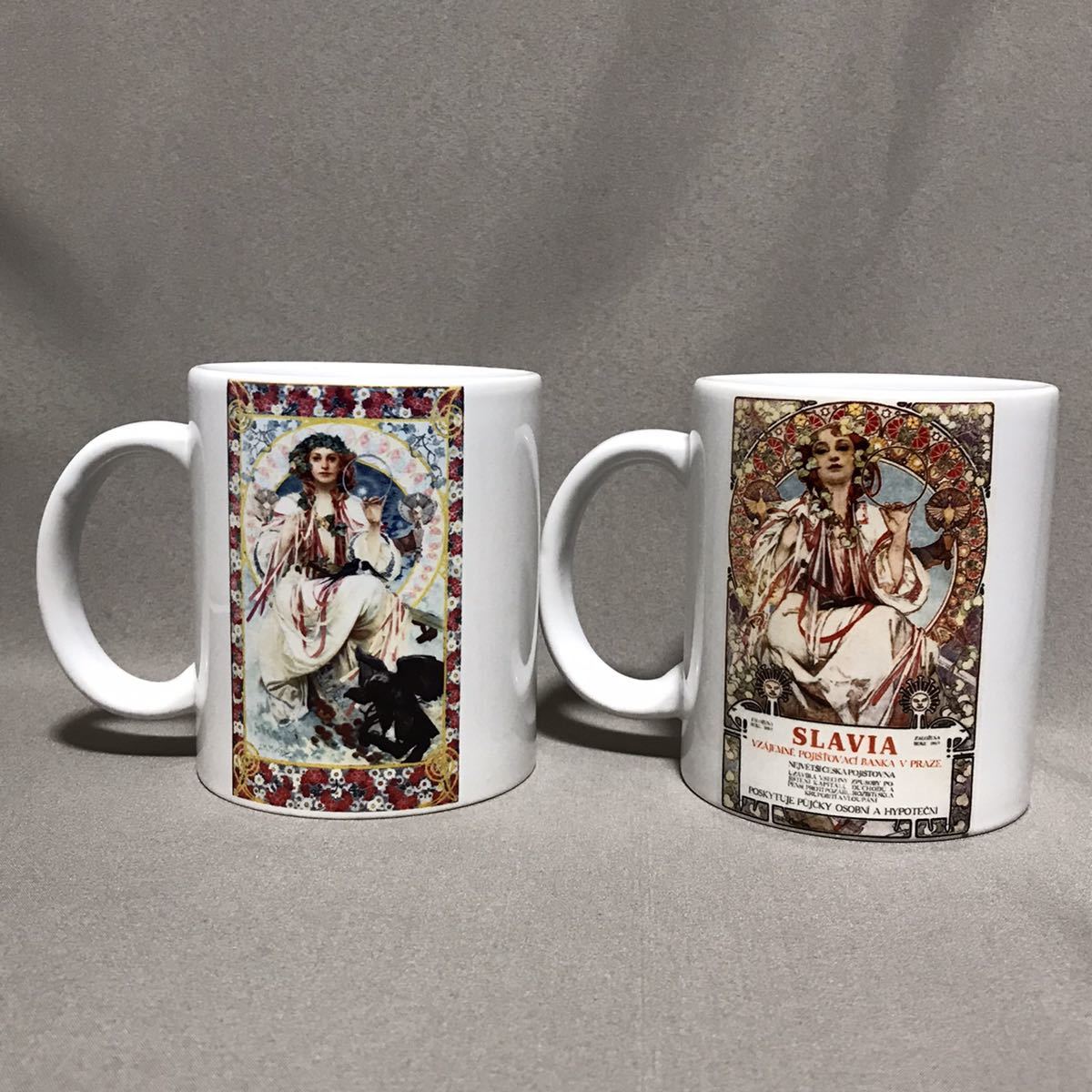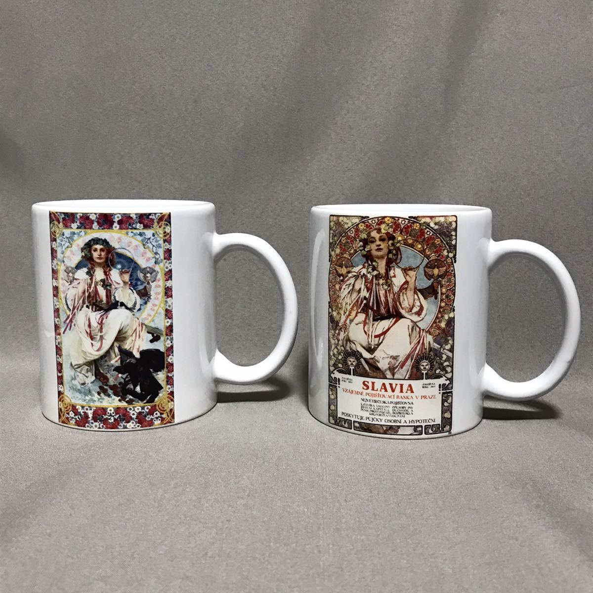ミュシャ のスラヴィアと、スラヴィア保険相互銀行を、それぞれ左右両面に美しくプリントした陶器マグカップ2個セット、新品。