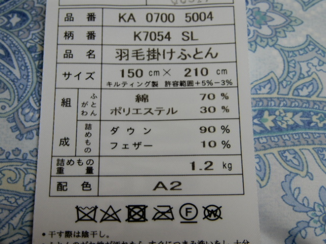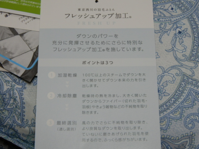 | 商品サイズ : 150×210cm キルティング製 許容範囲+5%-3% 材質 : ふとんがわ 綿70%ポリエステル30%(抗菌防臭加工) 詰めもの ダウン90% フェザー10% 詰めもの重量 1.2kg ウクライナシルバーグースダウン 商品状態 : 新品・未使用 ・フレッシュアップ加工 ダウンのパワーを発揮させるためにさらに特別なフレッシュアップ加工を施しています。 加湿乾燥・・100℃以上のスチームでダウンを大きく開かせて ダウン本来の力を引き出します。 冷却除塵・・乾燥時の熱を冷まし、大きく開いたダウンからファイバー(切れた羽毛、 羽根)やきょう雑物などの不純物をきれいに除去。 最終選別・・風の力でさらに不純物を取り除き、より上質なダウンを取り出します。 ・丁寧に磨きあげられた羽毛を使用するので、ふっくら感が違います。 ・羽毛が片寄らない新立体キルト(ユニステークキルト) ・お色違いございます。 ・日本製 西川産業株式会社 | |||