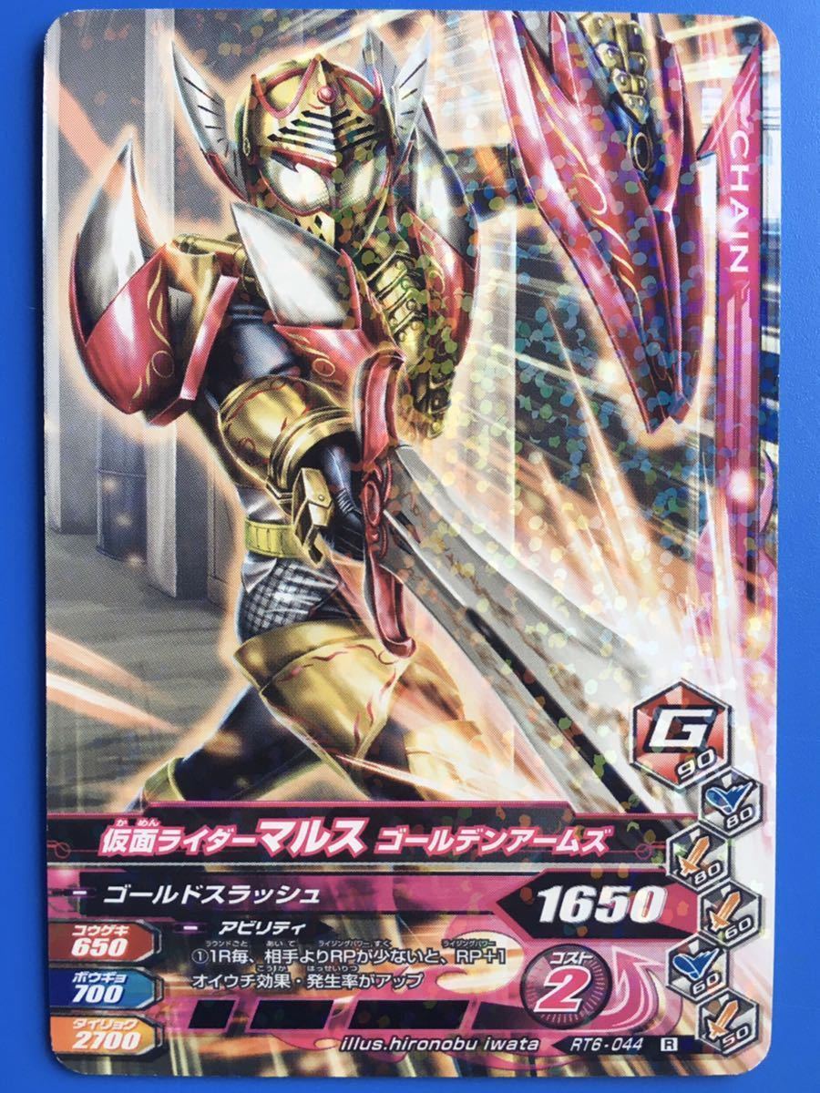 仮面ライダー、ガンバライジングの第RT6弾から、No.044《仮面ライダーマルス・ゴールデンアームズ》の登場です。発送は、普通郵便を利用します。(特にご希望のない場合)おとりまとめも可能ですが、送料に変動が出ますこと予めご了承ください。他にも多数出品中です。まとめてこの機会にいかがでしょうか?ご質問お待ちしております。