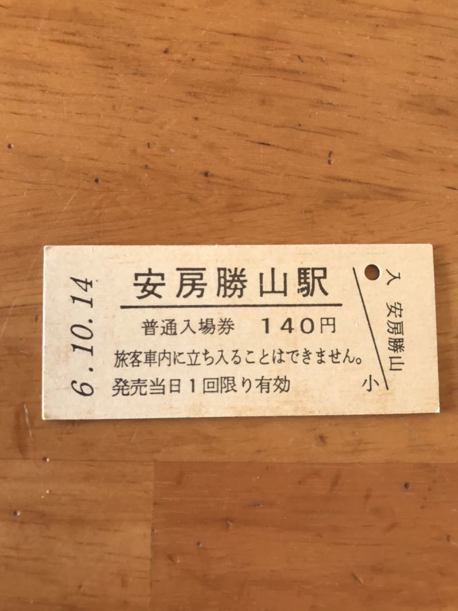 JR東日本内房線安房勝山駅のB型硬券入場券です。(平成6年)