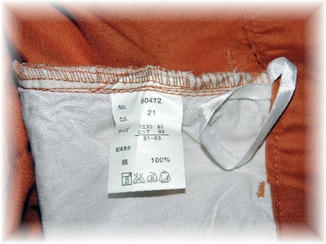 =委託品= 中古品はクリーニング又はホームクリーニング済です。 新品・未使用品については現状のお渡しとなります。 保管の際のシワがございます。 ■■商 品 ラ ン ク■■ A0新品・未使用品です。 A1訳アリ新品・未使用品です。 B0未使用品に近い中古品です。 B1目立ったシミ・汚れ等が無い一般的な中古品です。 B2使用感(ヨレ)・毛羽立ち等あります。 B3薄め・小さめのシミ・汚れ・傷等があります。 B4目立ったシミ・汚れ・傷等があります。 B5ジャンク品です。 *注:感じ方には個人差がございます。 【レベル:B1】 目立ったシミ・汚れ等見当たりません。 ≪タグ表示≫ サイズ:M ウェスト:61 ヒップ:93 ≪平置きサイズ≫ 多少の誤差はご容赦下さる様お願いします。 ウェスト:約36cm 着丈:約30.5cm また下:約10cm また上:約22cm 裾幅:約28cm ≪素材≫ 綿100% ≪色・柄≫ ブラウンオレンジ 代赭 (たいしゃ) ≪お願いとご注意≫ ・新品・未使用品でも一度は人手に渡った物ですので完璧を求める方はご入札をご遠慮下さい。 ・お振込み手数料はご負担下さいます様お願いします。 ・仕事・家事の合間で作業をしておりますのでお急ぎの方のご入札をご遠慮下さい。 ・ご入金確認のタイミング(夜の確認)により発送が1~2日程遅れる場合がございます。 ・頂いた個人情報はお取引後すみやかに削除させて頂きます。 ・土日祭日の発送は郵便局都合によりお休みします。 ・フラッシュやPC環境により色が違う場合がございます。 ・喫煙者おりません。ペット(猫)がおります。 ・クリックポストは厚さ3cm未満と決められておりますので、圧縮袋での発送になリます。そのため、パッドのへこみ等ございますので、気になる方はレターパックプラスかゆうパックでの発送をお勧めします。 ・評価はご指示がない限り商品受け取り完了のお知らせ後にさせて頂いております。 ≪不要の方はお手数おかけしますがメッセージをお願いします。≫ | |||