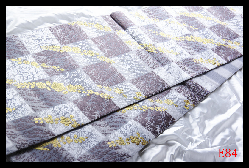 軽やかに織りなされた帯地は白練と葡萄鼠の濃淡で市松を表現して。