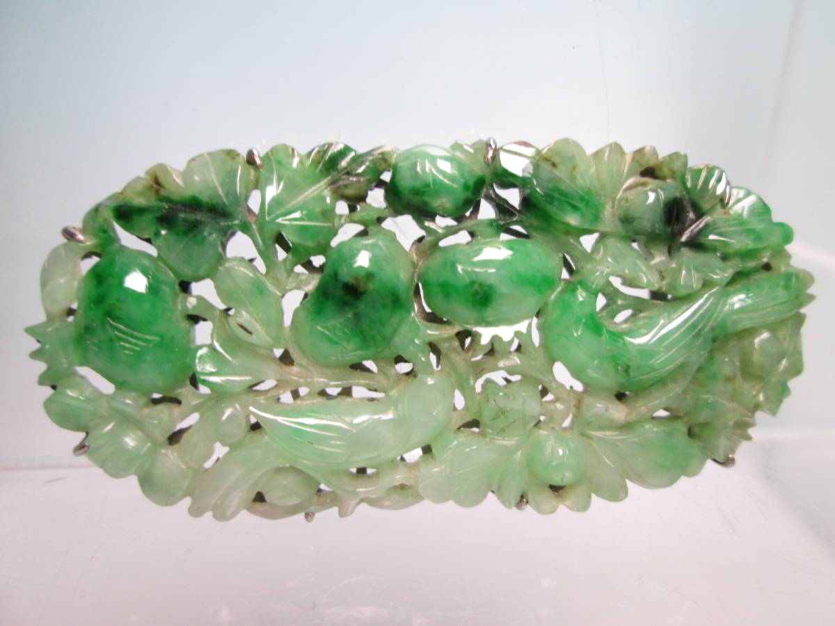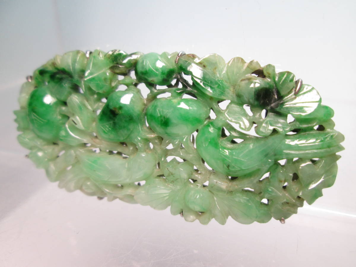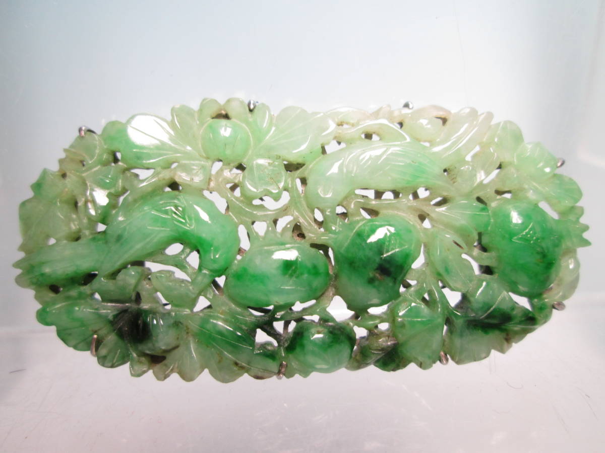 【江月】アンティーク・大振り 6cm 本翡翠 花鳥透かし彫刻の帯留め 15g