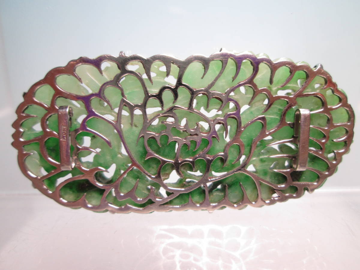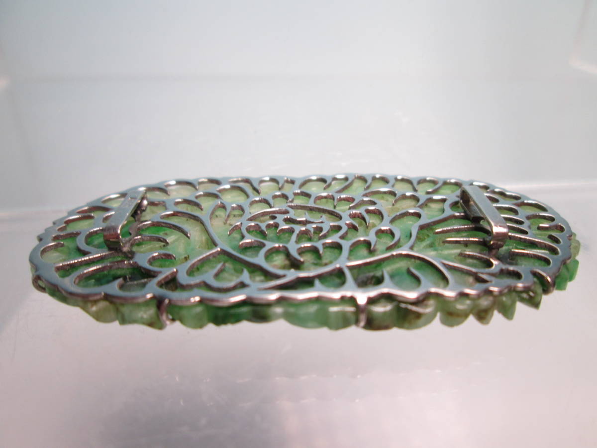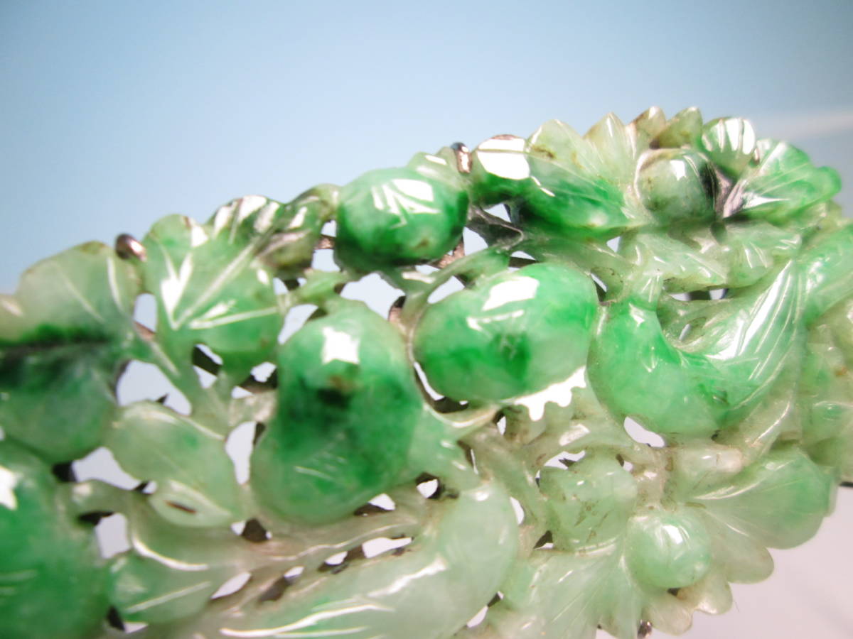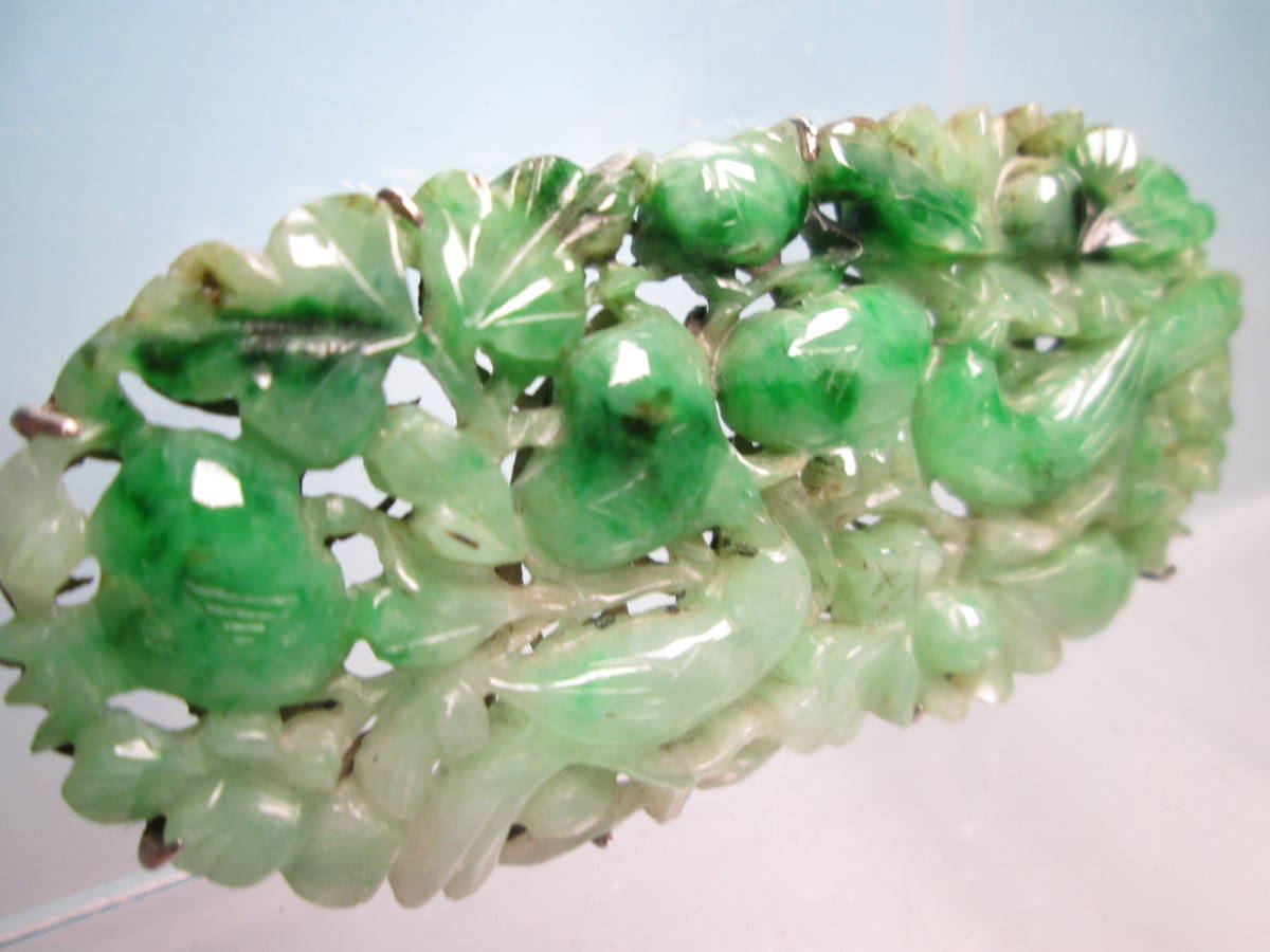 【江月】アンティーク・大振り 6cm 本翡翠 花鳥透かし彫刻の帯留め 15g