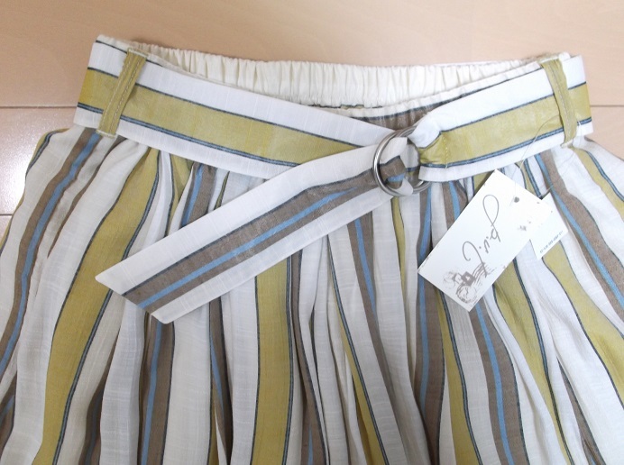 Bleu Bleuet/ブルーエブルーエ☆オシャレ 素敵! リネン ストライプ ベルト付 ロング スカート M 即決 白 ホワイト 黄 ブラウン 水色 ブルー