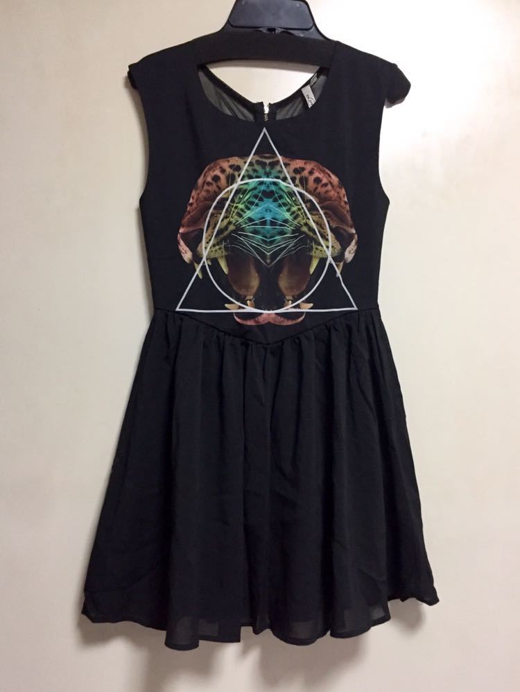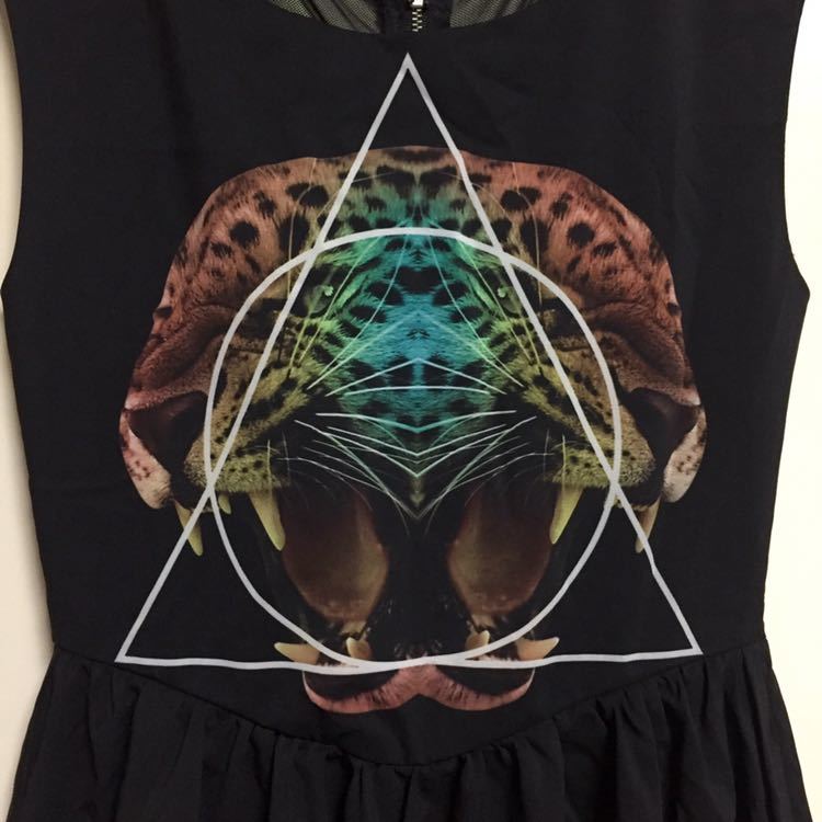 クールなプリントのミニワンピです。背中はメッシュになっていて透けます。さらっとした素材。