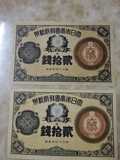 改造紙幣20銭 大蔵卿20銭の極美品を2枚セットです。